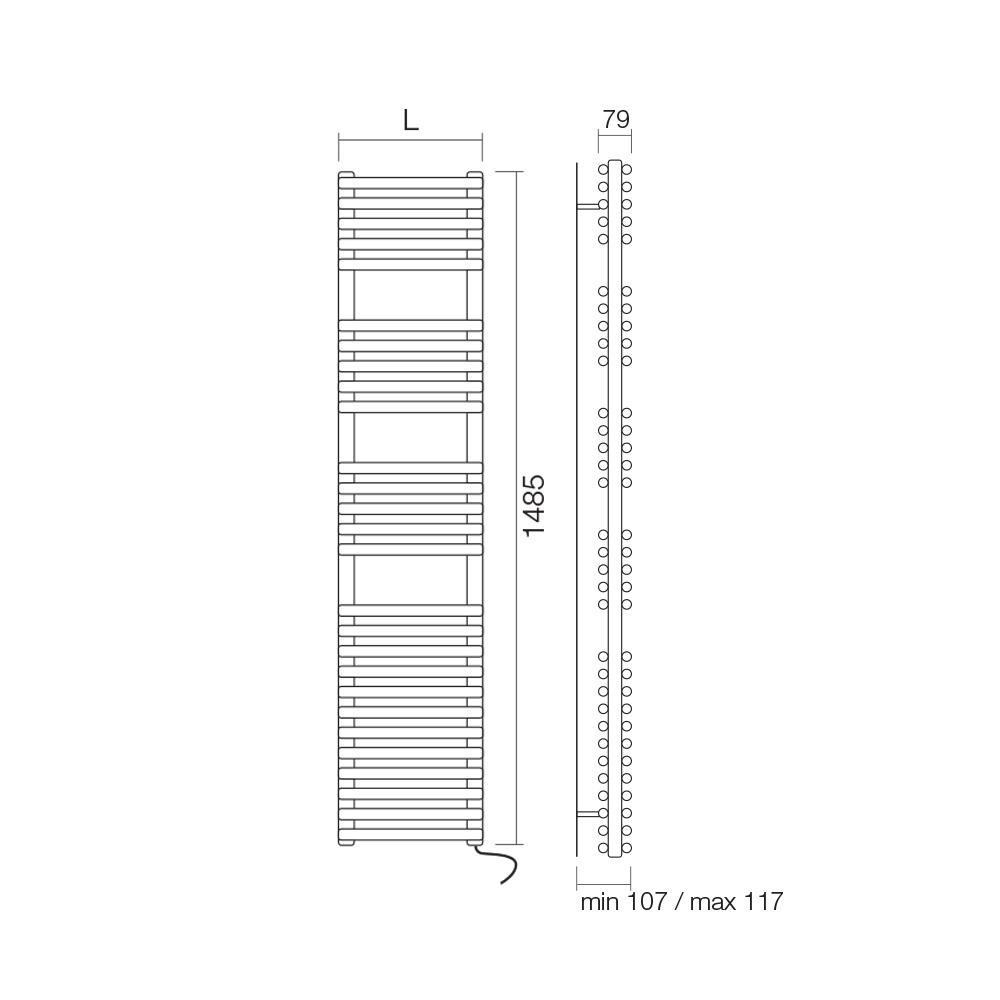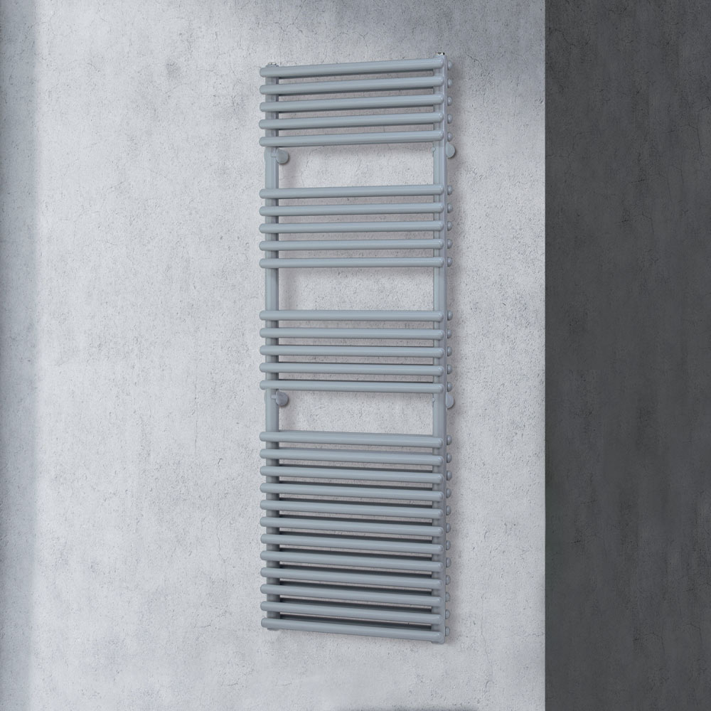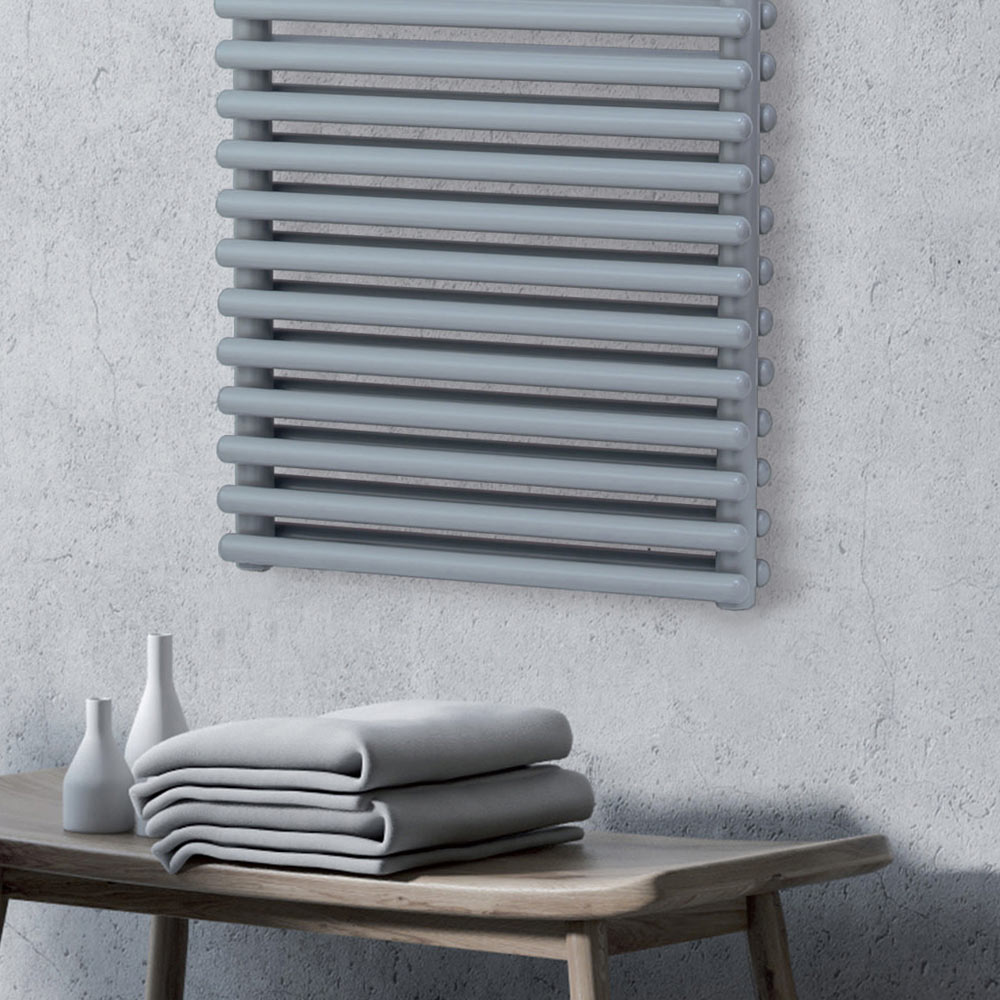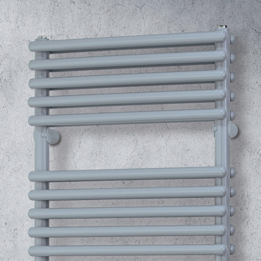 Elektrischer Handtuchwärmer aus Kohlenstoffstahl mit verkehrsgrauer Oberfläche mit horizontalen Elementen und vertikalen Kollektoren, vollständig in Italien hergestellt, inklusive Wandbefestigungsset . Elektrifizierungssatz unten rechts positioniert.