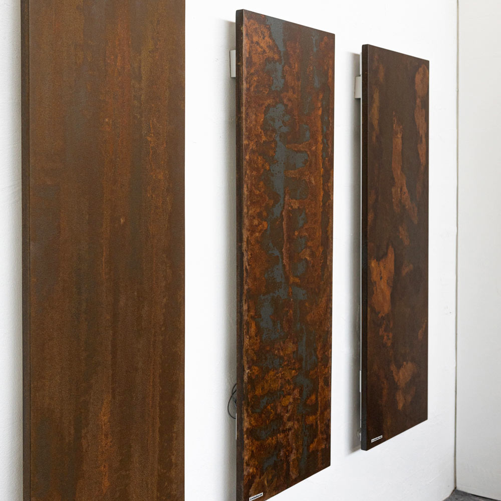 Nach einer zweiten Vernebelungsphase, um die Reaktion erneut zu aktivieren, folgt abschließend eine Behandlung auf Basis einer Spezialfarbe zum Schutz des Heizkörpers. Das Endergebnis, das aus den Verarbeitungsphasen hervorgeht, ist daher eine Oberfläche mit der typischen nicht homogenen Farbe von Corten, die das Helle und Dunkle von Rost zu einem originellen und harmonischen Farbspiel kombiniert.