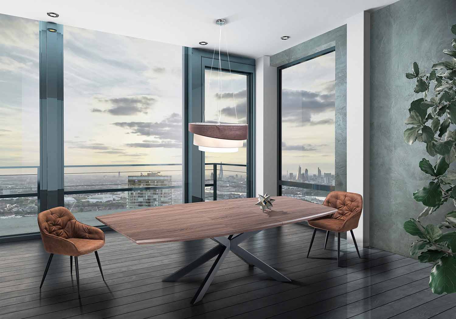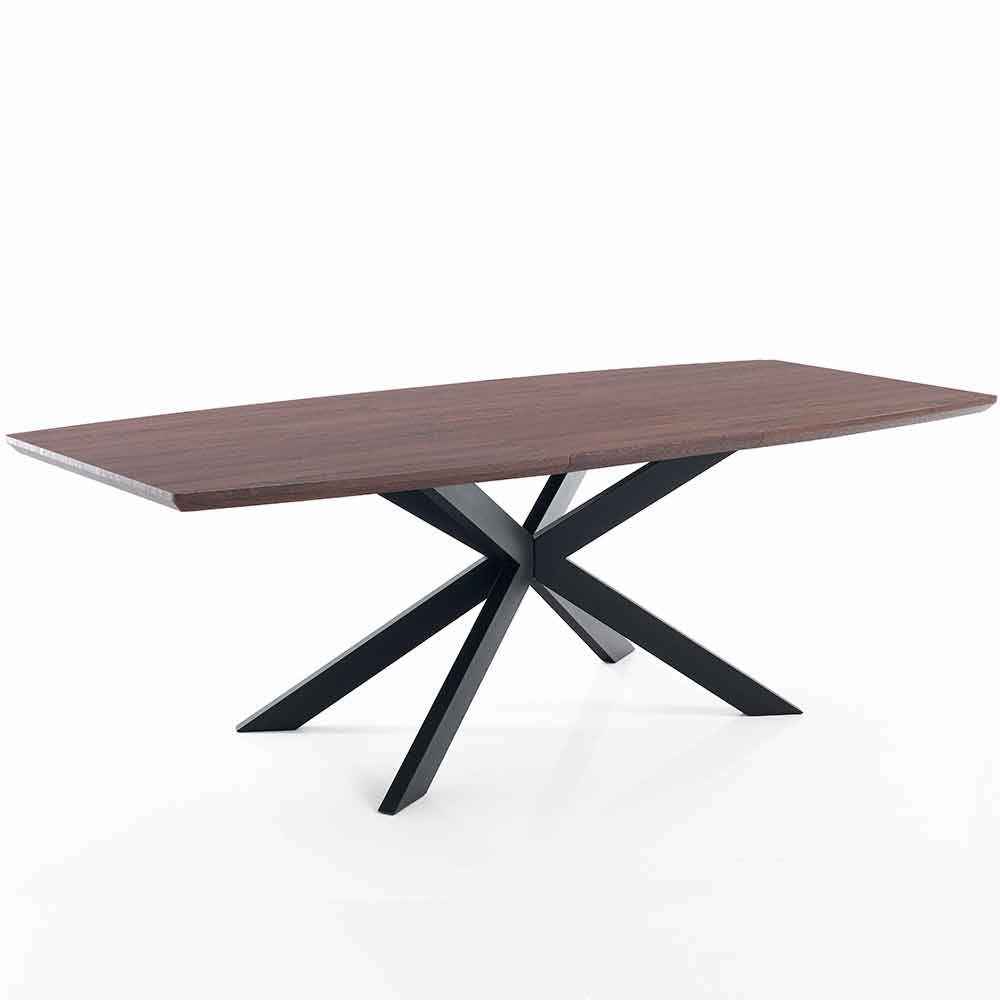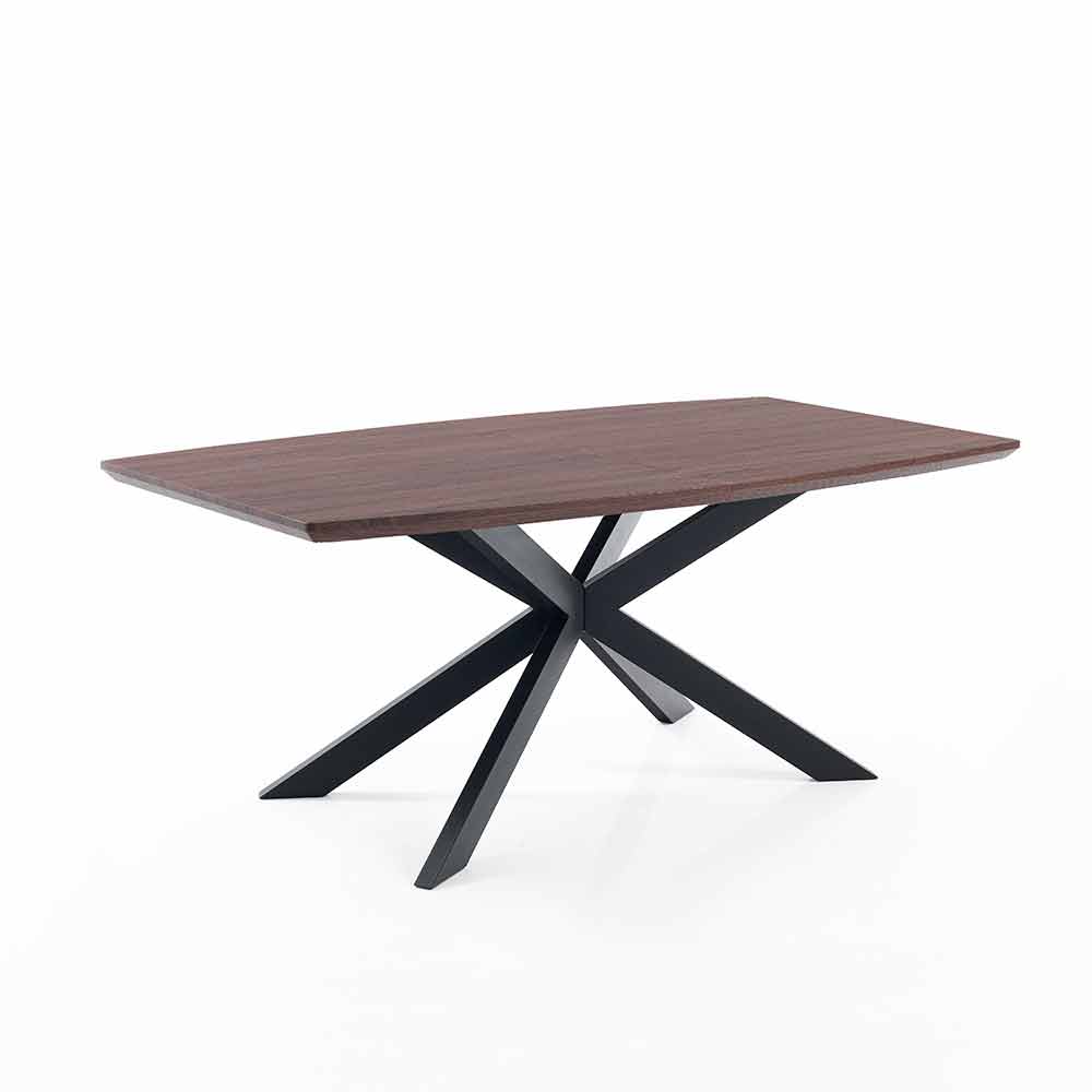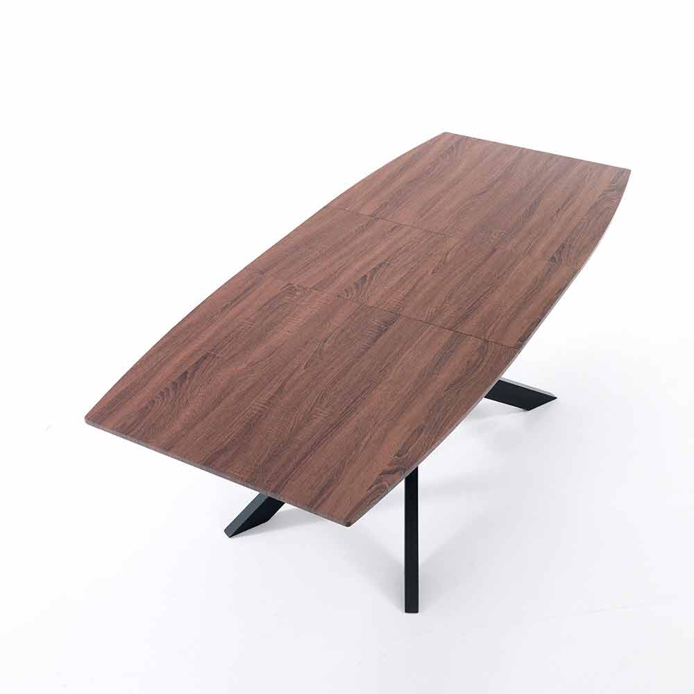 Torquato ist ein heller ausziehbarer Esstisch mit einer MDF-Tischplatte (4 cm dick), die mit 3D-Papier in dunklem Nussbaum-Finish und mattschwarzen Metallbeinen bedeckt ist.
