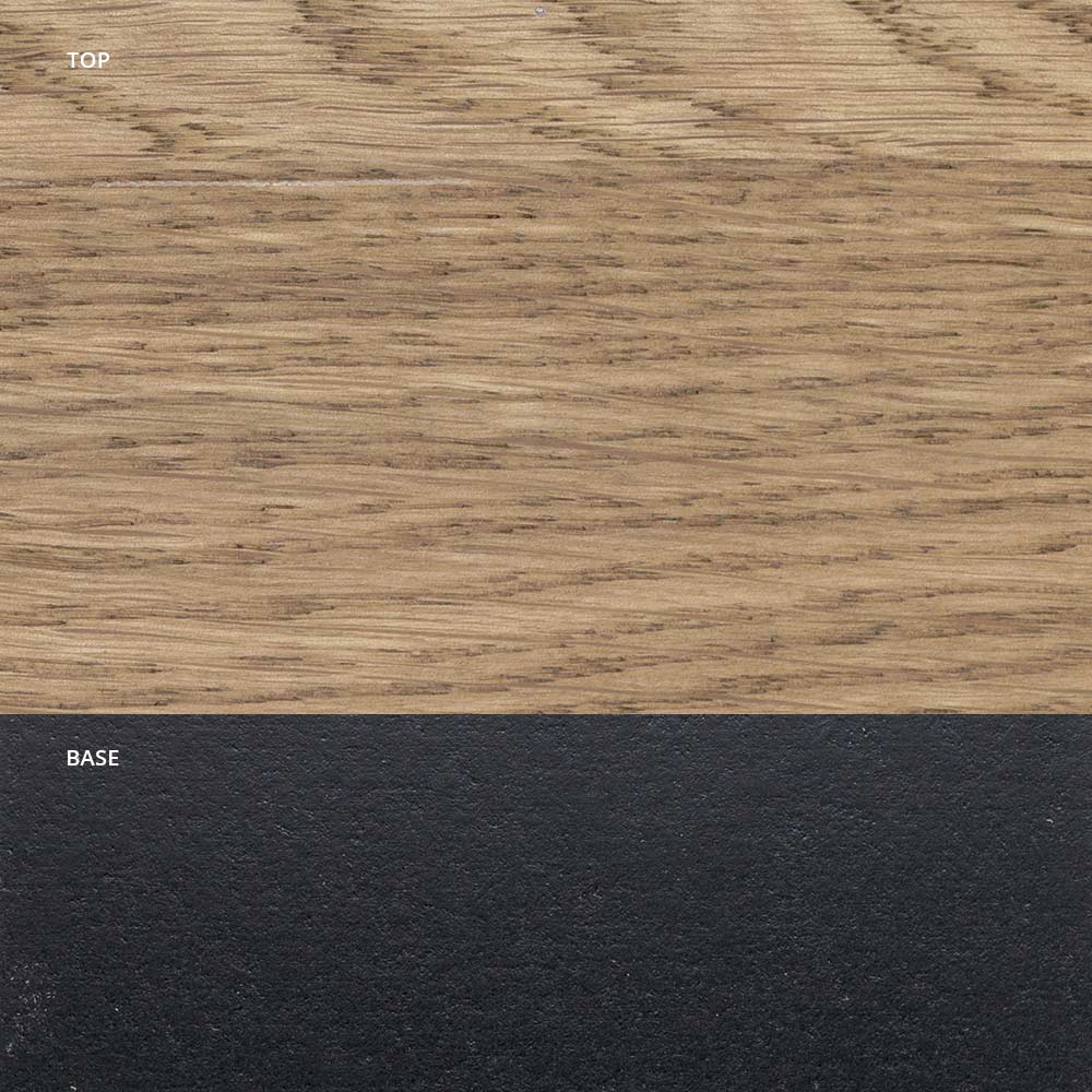 Die Tischplatte ist mit brauner, massiver Asteiche furniert und die Basis aus mattschwarzem Metall.
