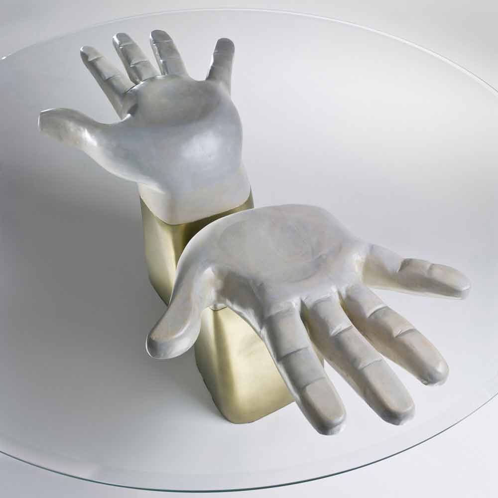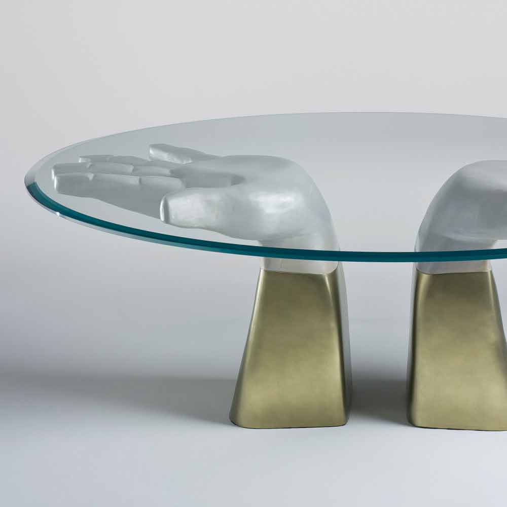 Struktur und Ornament verstärken sich gegenseitig: Das runde Oberteil wird von den Handflächen zweier Hände gestützt, riesigen handgeschnitzten Holzgliedern mit goldenen Manschetten, die an Pop-Vorschläge erinnern. Die Oberseite besteht aus abgeschrägtem Glas.