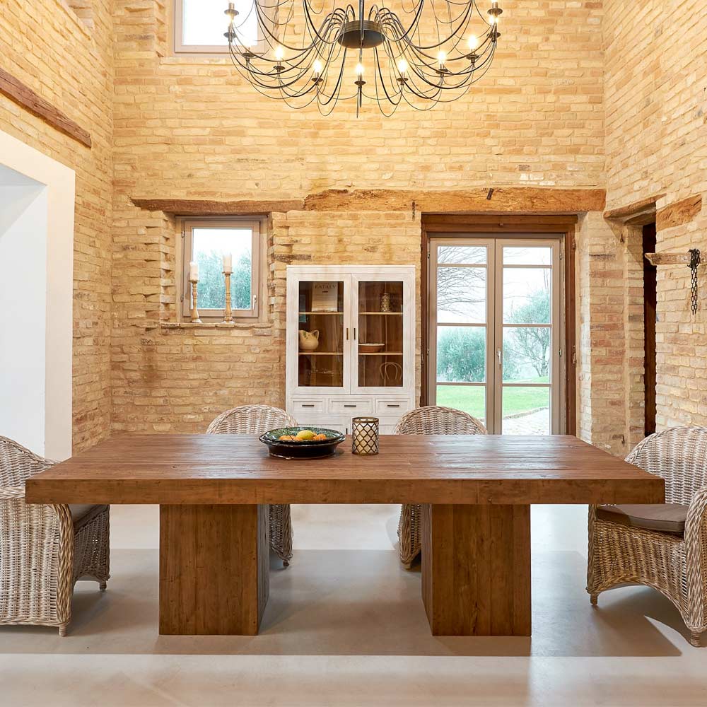 Esstisch aus aus recyceltem Holz in natürlicher Kaffeefarbe mit doppeltem Sockel .