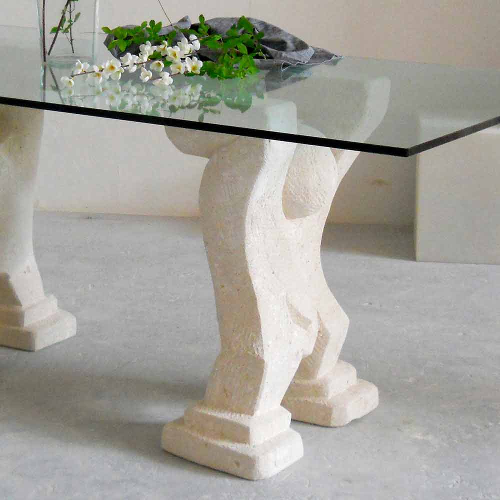 Die Basis ist aus Naturstein aus Vicenza hergestellt und wird von Hand bearbeitet. Die Tischplatte besteht aus Kristall float mit einer Dicke von 15 mm und ist an dem Stein mit einem Flansch befestigt.