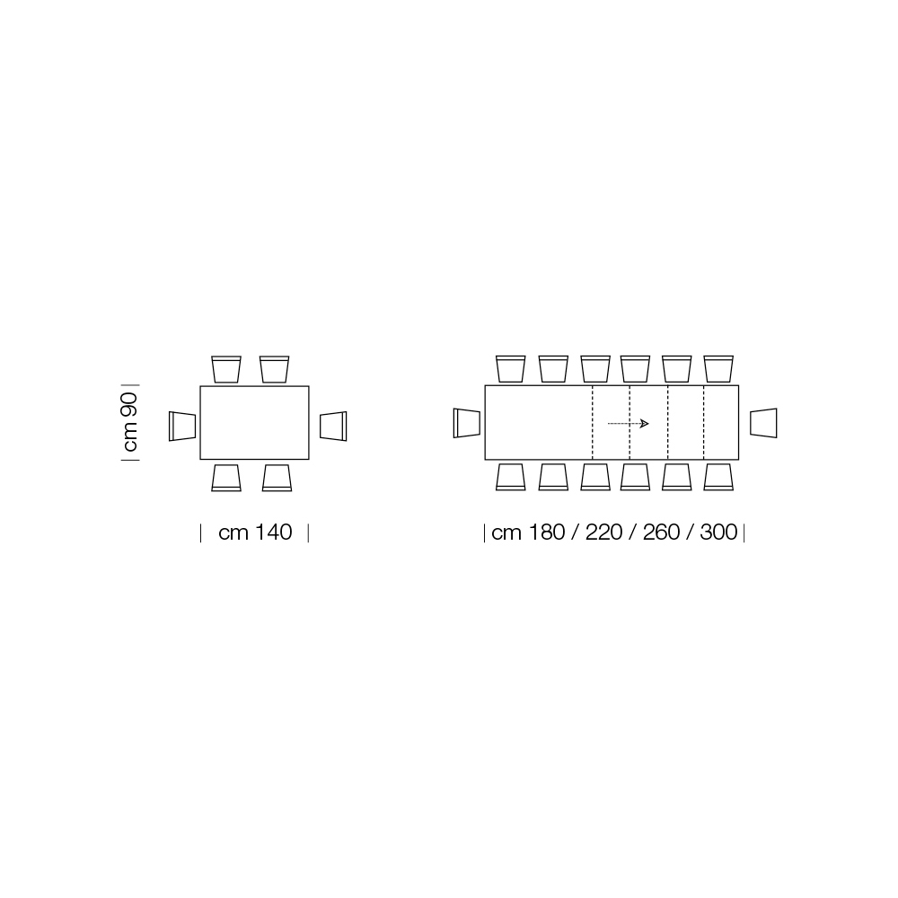 • L 140 (300) x T 90 x H 75 cm. 14-Sitzer ausziehbar mit vier internen Verlängerungen von jeweils 40 cm;