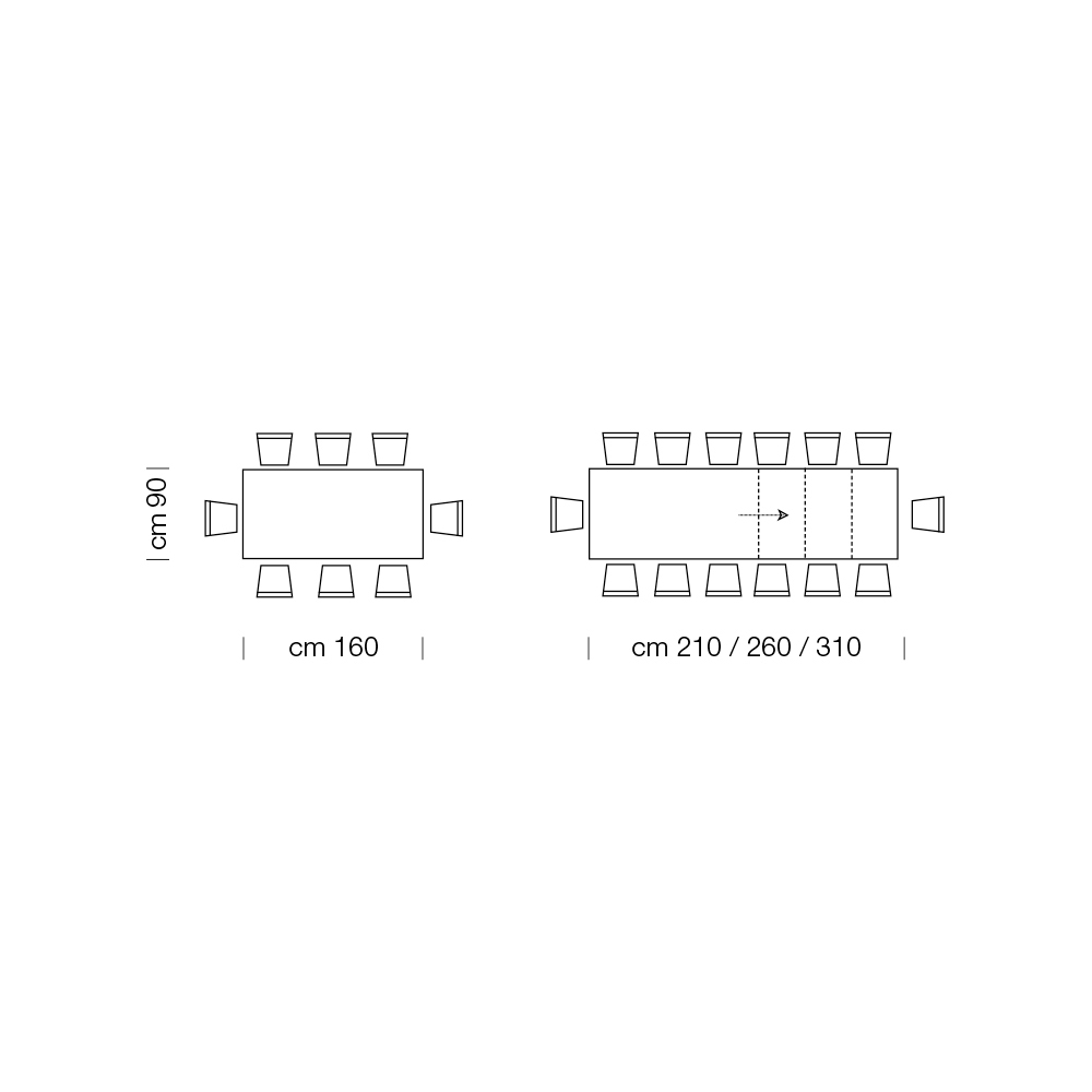 • L 160 (310) x T 90 x H 75 cm. 14-Sitzer ausziehbar mit drei internen Verlängerungen von jeweils 50 cm.