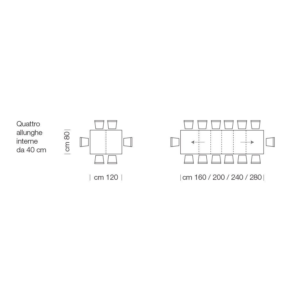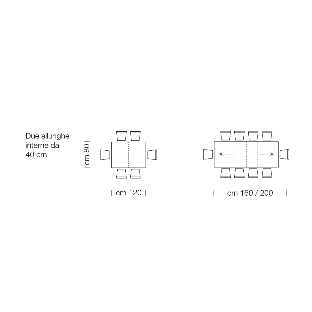 - L 200 (470) x T 120 x H 77 cm. 22-Sitzer, erweiterbar mit sechs 45-cm-Verlängerungen, drei interne und drei in einer wiederverwendbaren Pappschachtel geliefert.