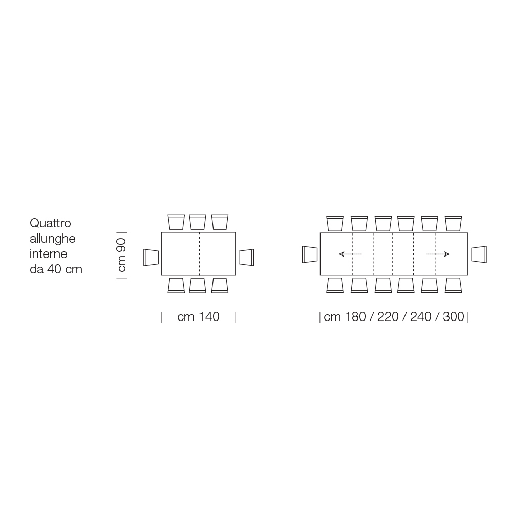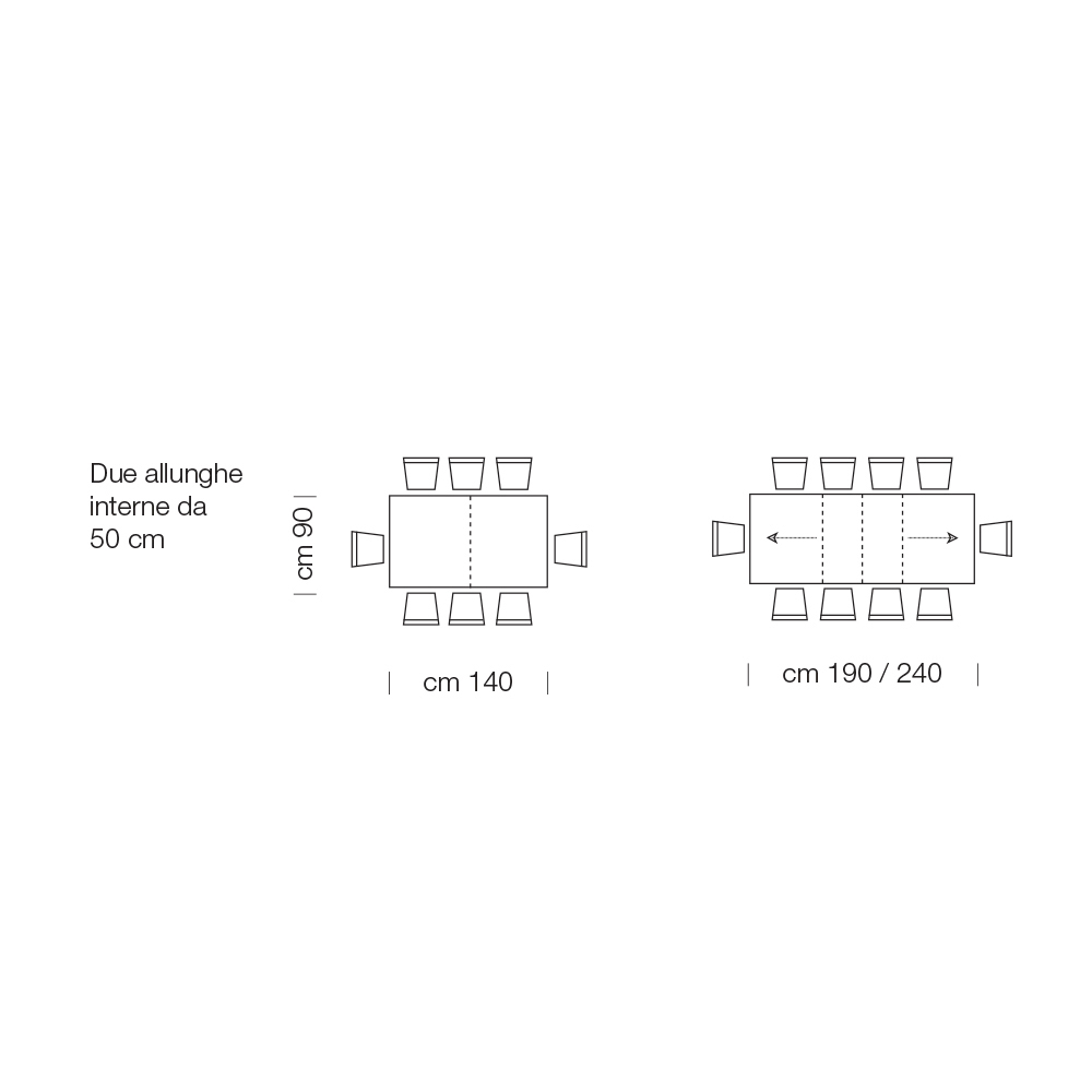 - L 140 (240) x T 90 x H 77 cm. 10-Sitzer ausziehbar mit zwei internen Verlängerungen von jeweils 50 cm;