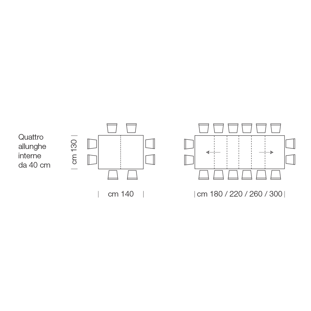 - L 140 (410) x T 90 x H 77 cm. 18-Sitzer, erweiterbar mit sechs 45-cm-Verlängerungen, drei interne und drei in einer wiederverwendbaren Pappschachtel geliefert;