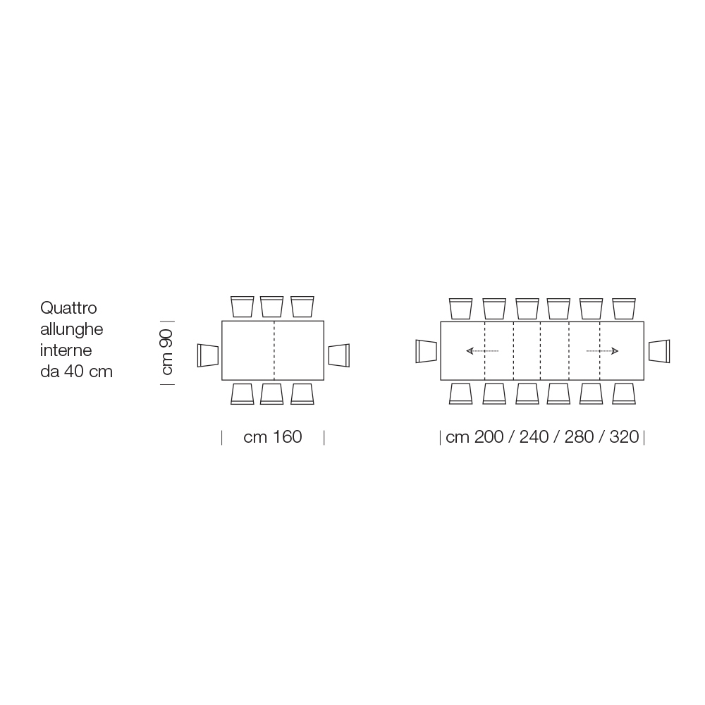 - L 160 (430) x T 90 x H 77 cm. 18-Sitzer, erweiterbar mit sechs 45-cm-Verlängerungen, drei interne und drei in einer wiederverwendbaren Pappschachtel geliefert;