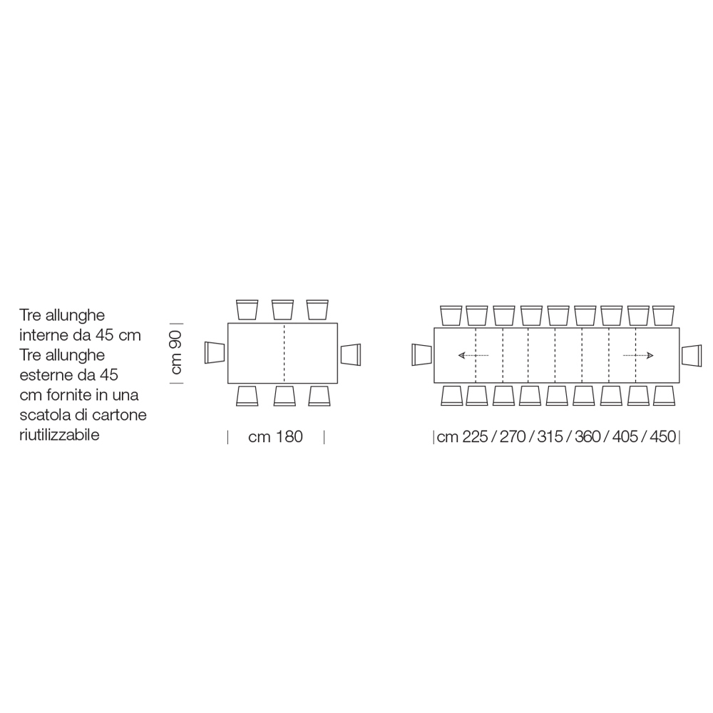 - L 180 (450) x T 90 x H 77 cm. 20-Sitzer, erweiterbar mit sechs 45-cm-Verlängerungen, drei interne und drei in einer wiederverwendbaren Pappschachtel geliefert;