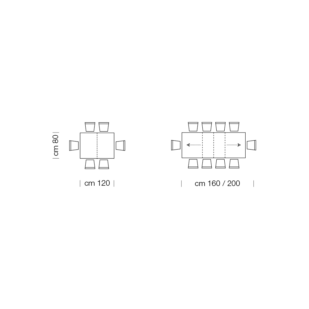 - L 200 (470) x T 120 x H 77 cm. 22-Sitzer, erweiterbar mit sechs 45-cm-Verlängerungen, drei interne und drei in einer wiederverwendbaren Pappschachtel geliefert.