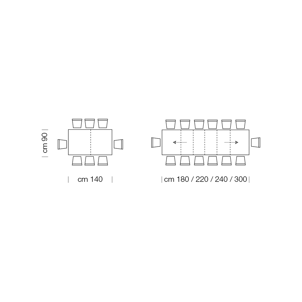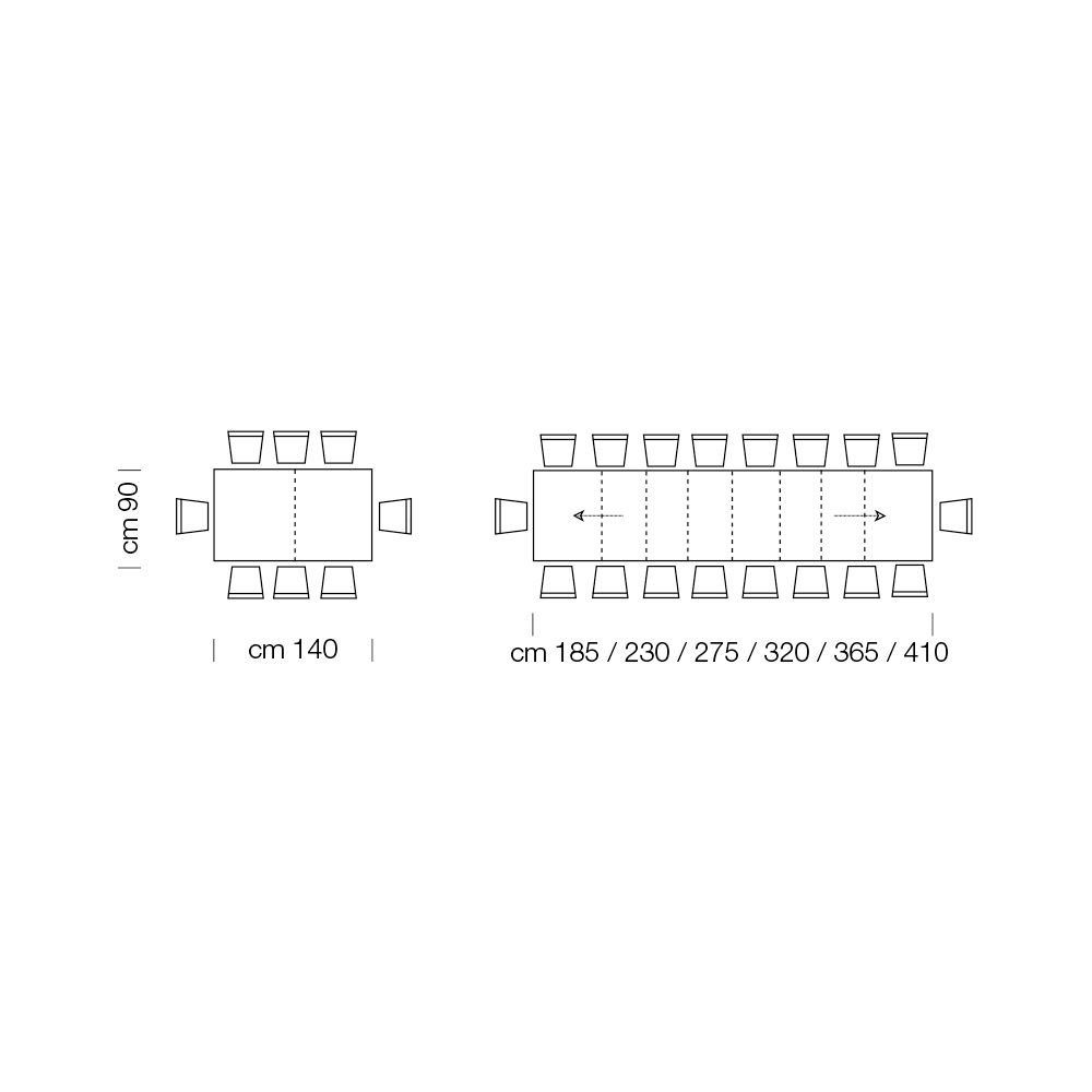 - L 140 (410) x T 90 x H 77 cm. 18-Sitzer, erweiterbar mit sechs 45-cm-Verlängerungen, drei interne und drei in einer wiederverwendbaren Pappschachtel geliefert;