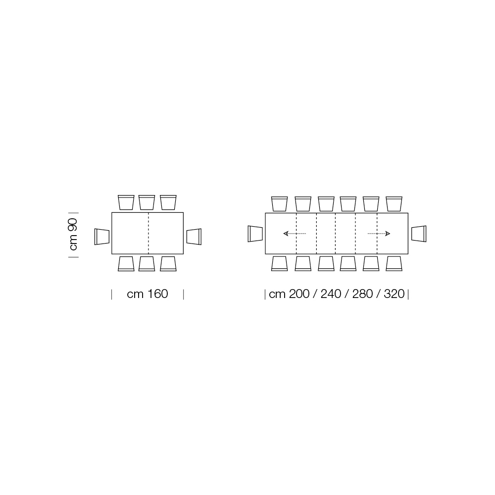 - L 160 (430) x T 90 x H 77 cm. 18-Sitzer, erweiterbar mit sechs 45-cm-Verlängerungen, drei interne und drei in einer wiederverwendbaren Pappschachtel geliefert;