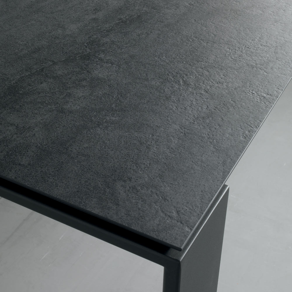 graphitpulverbeschichtetem Metall und einer Platte mit kraftunterstützter Klappverlängerung aus undurchsichtiger Keramik auf einer Platte mit einem ausziehbaren Aluminiumrahmen.