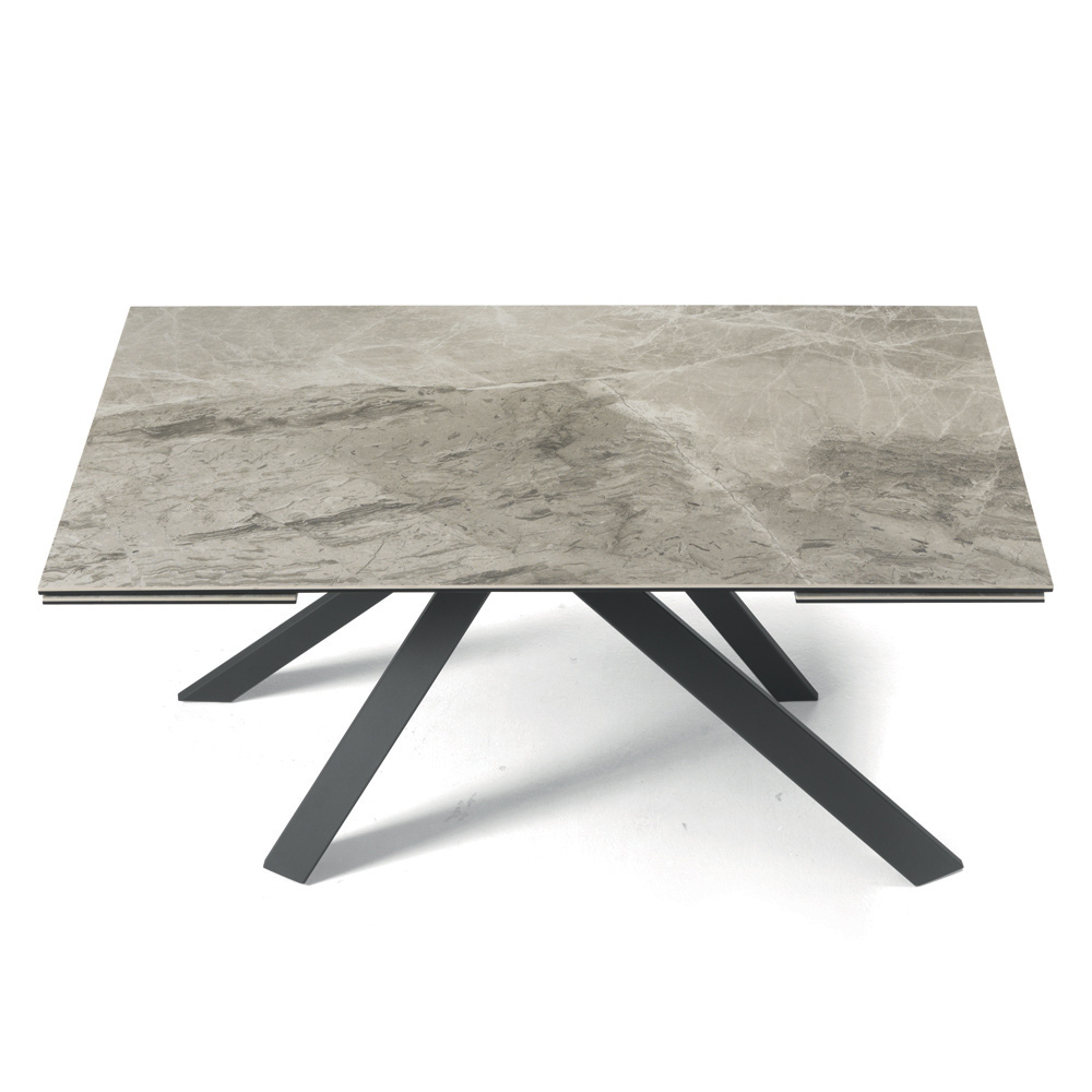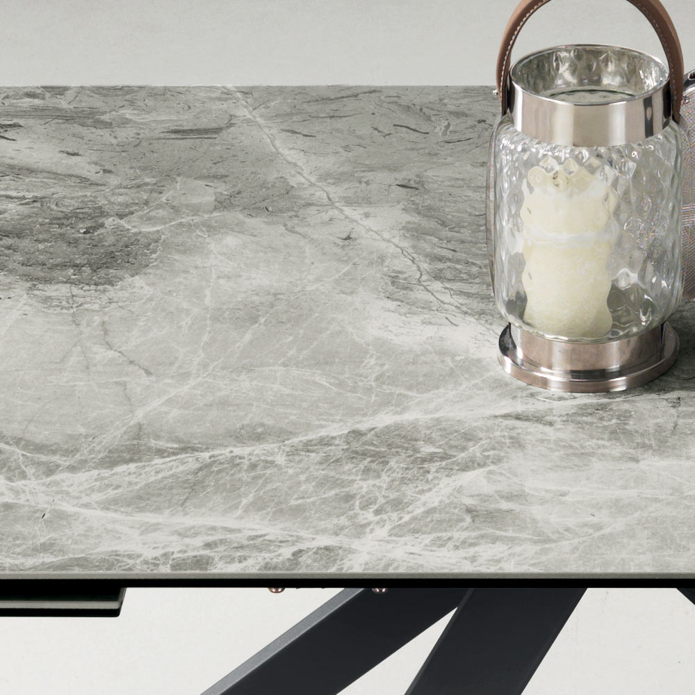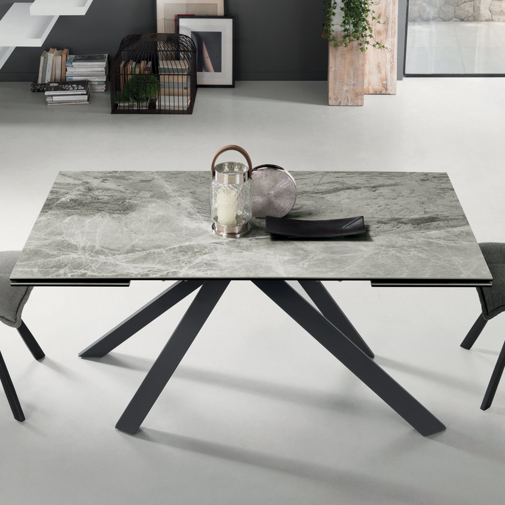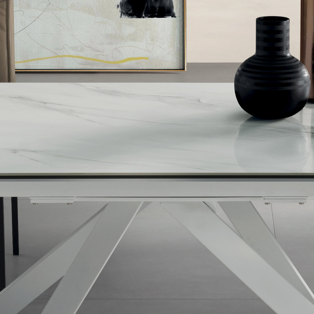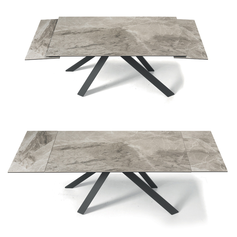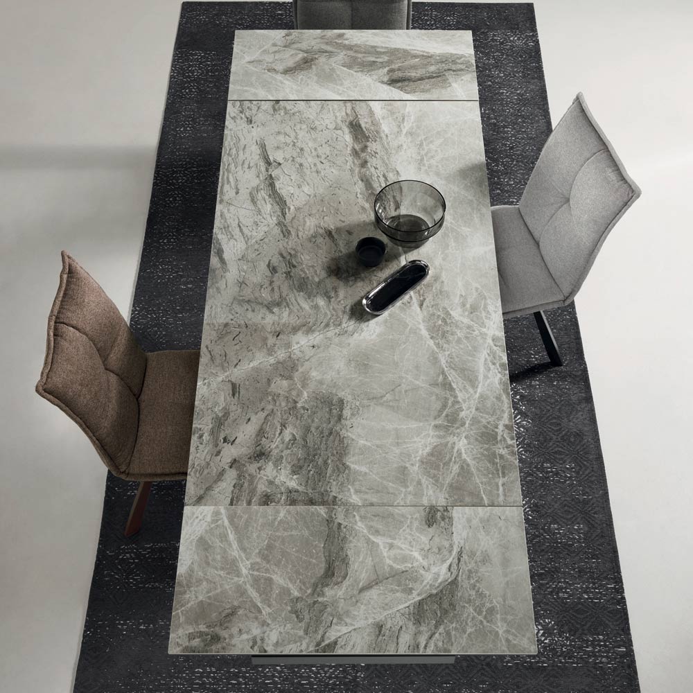 Esstisch mit Platte aus Feinsteinzeug in Marmoroptik, erweiterbar auf bis zu 240 cm dank der beiden mitgelieferten Verlängerungsplatten von 40 cm und Struktur aus lackiertem Metall . Dieses Produkt ist perfekt für diejenigen, die gerne Mittag- und Abendessen mit Freunden organisieren, ohne auf Stil und Eleganz zu verzichten.