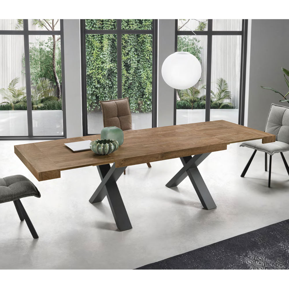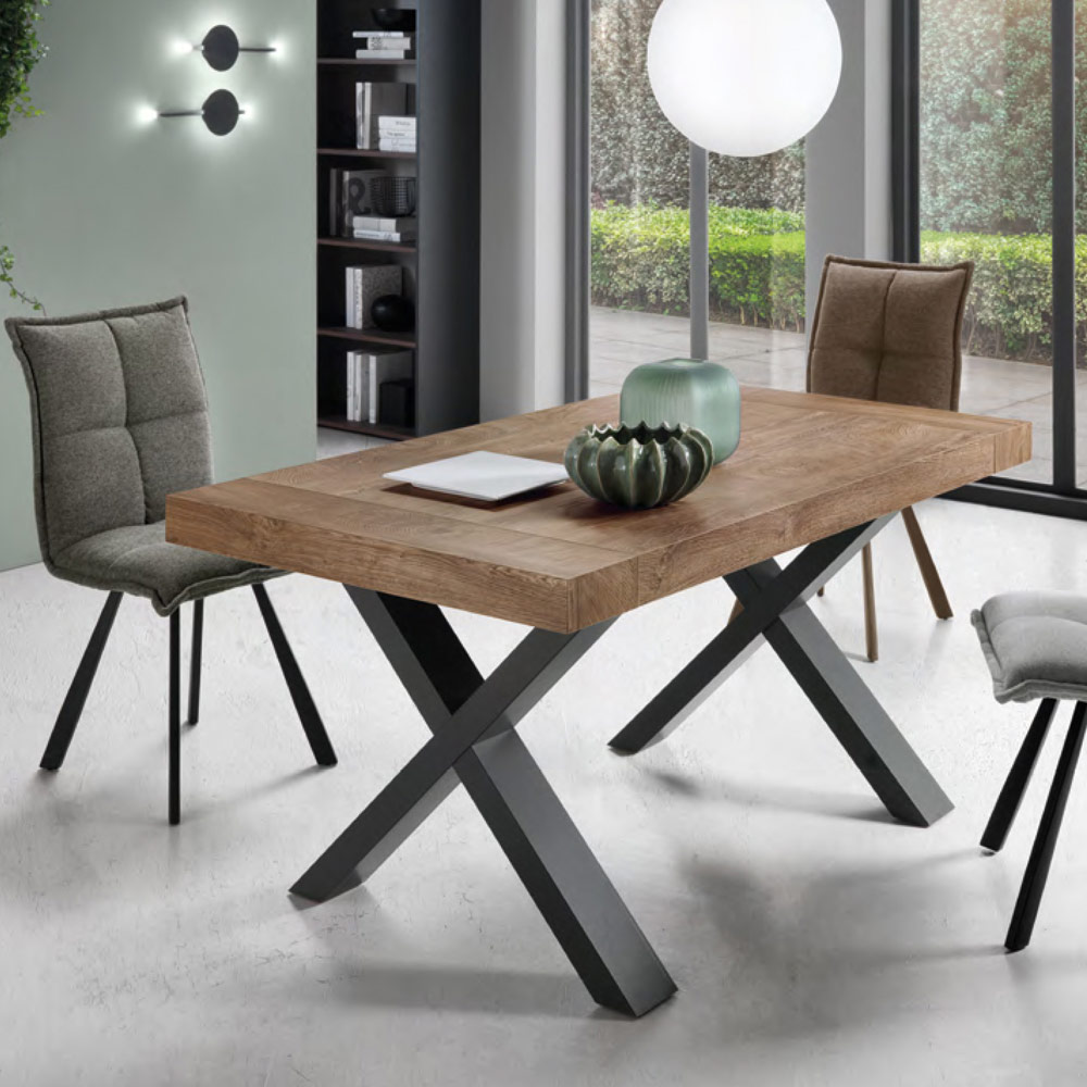 Seine Stärke ist die Platte, die dank zweier seitlicher Verlängerungen von jeweils 50 cm eine Länge von 260 cm erreicht und so Platz für bis zu 10 Personen bietet. Dieser Aspekt macht es zu einer idealen Einrichtungslösung für diejenigen , die gerne Mittag - und Abendessen mit Freunden organisieren und dabei nicht auf einen Hauch von