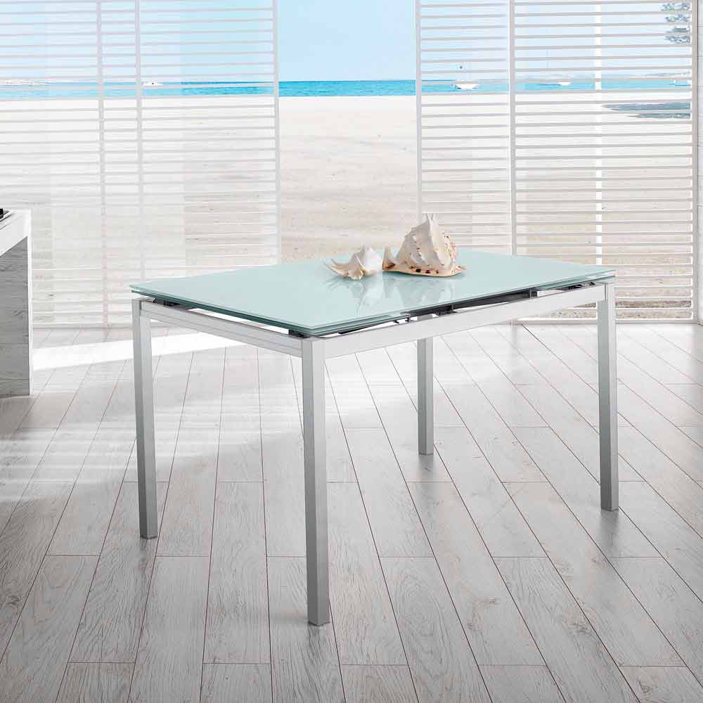 Dynamo ausziehbarer Esstisch . Dynamo- Designtisch mit Metallfuß und Regal aus gehärtetem Glas.