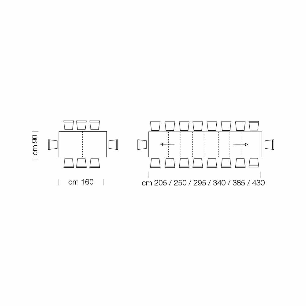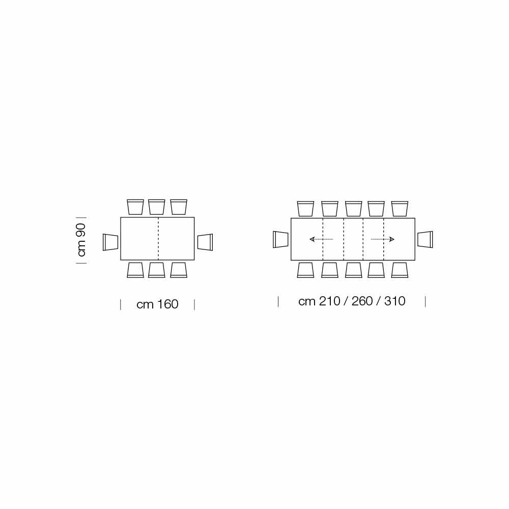 • L 160 (310) x T 90 x H 75,3 cm. 12-Sitzer ausziehbar mit drei internen Verlängerungen von jeweils 50 cm;
