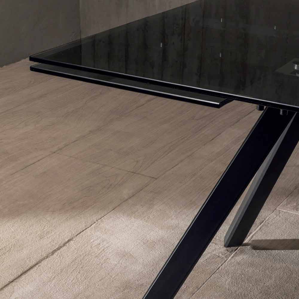 Der Designaspekt des Produkts wird zweifellos durch die raffinierte Platte aus gehärtetem Glas in transparentem, rauchschwarzem Finish in Kombination mit dem matt anthrazit lackierten Metall der Struktur verliehen, die durch die Besonderheit der schrägen Beine gekennzeichnet ist, die das Produkt einzigartig machen. Praktikabilität und Funktionalität ergeben sich stattdessen aus der Möglichkeit, die Oberseite auf bis zu 240 cm zu verlängern, sodass maximal 12 Personen für Mittag- und Abendessen mit der Familie Platz finden. Dies geschieht dank des Vorhandenseins von 2 seitlichen Verlängerungen von jeweils 40 cm, ebenfalls aus geräuchertem schwarzem Glas, die unter der Oberseite positioniert sind und bei Bedarf leicht entfernt werden können.