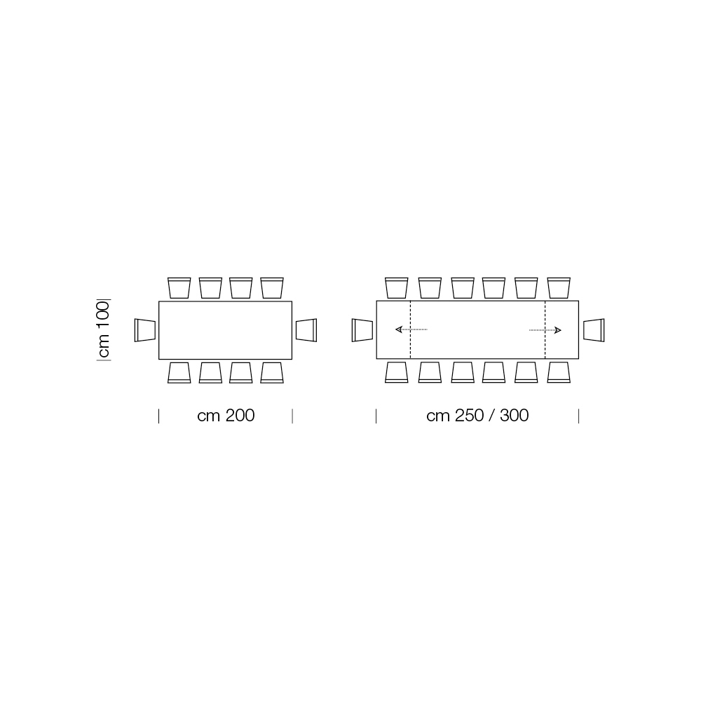 - L 200 (300) x T 100 x H 76,5 cm. 14-Sitzer, erweiterbar mit zwei 50 cm langen Außenverlängerungen.