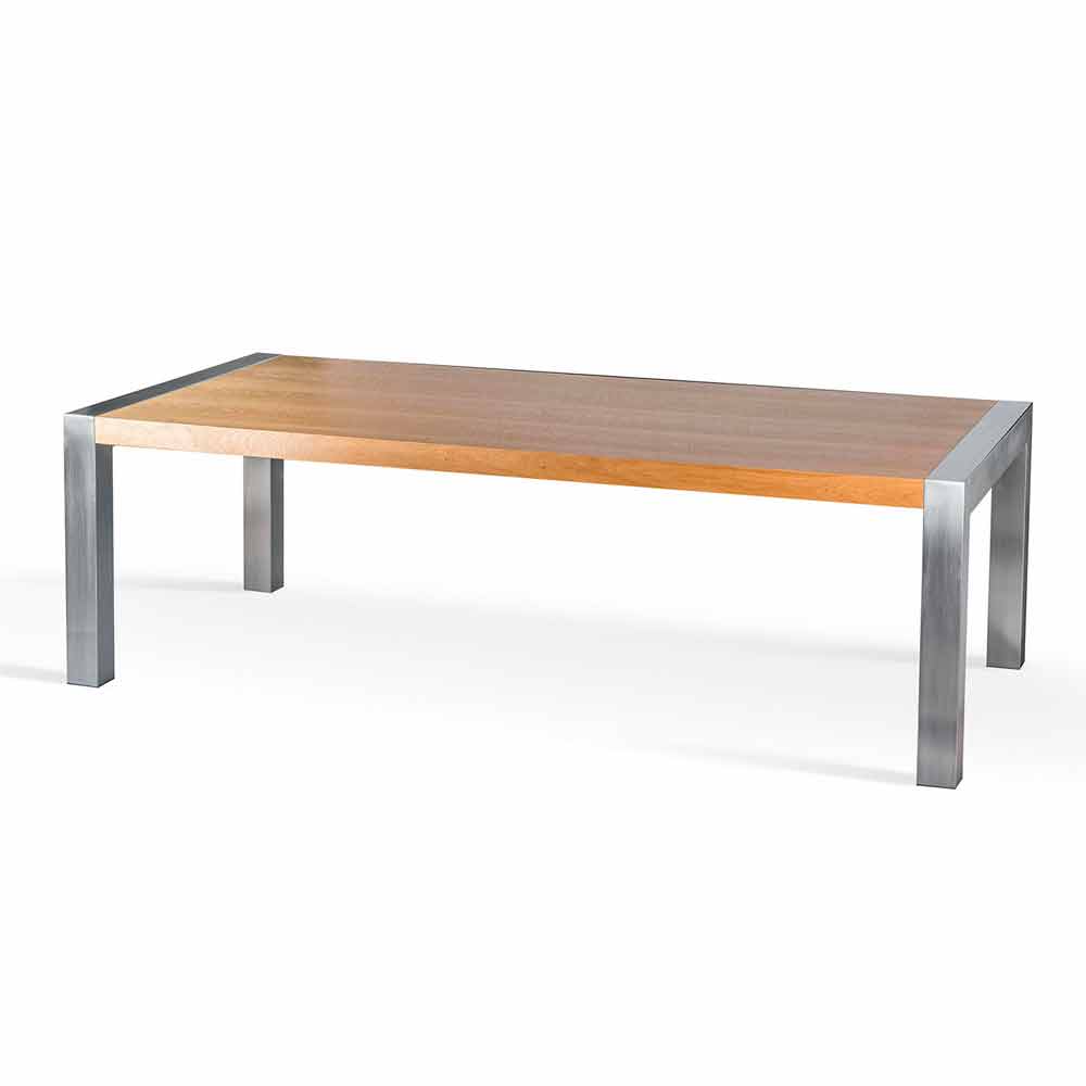 Rechteckiger Esstisch mit Tischplatte aus gebürsteter Eiche und Beinen aus Stahl.