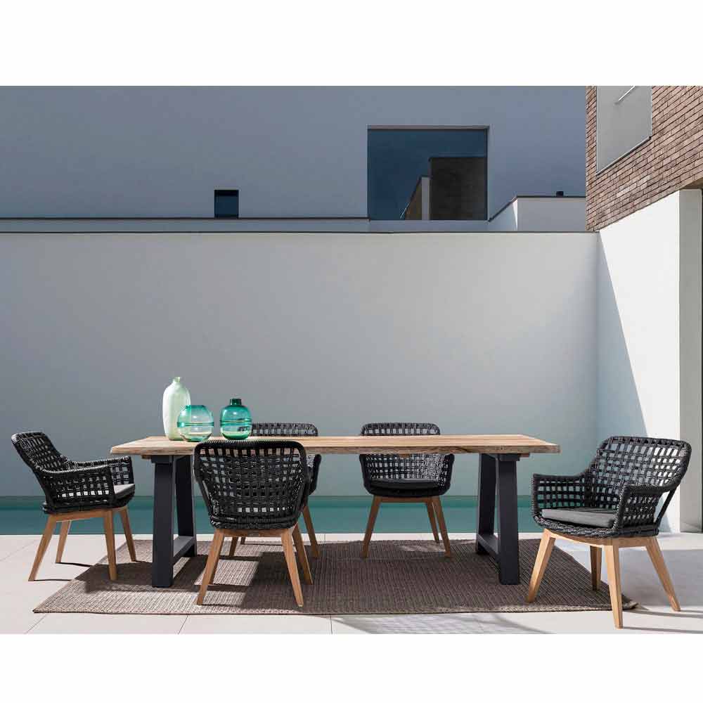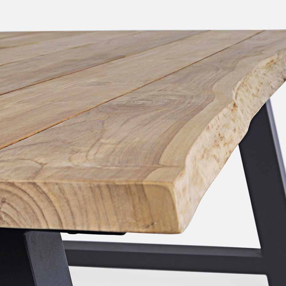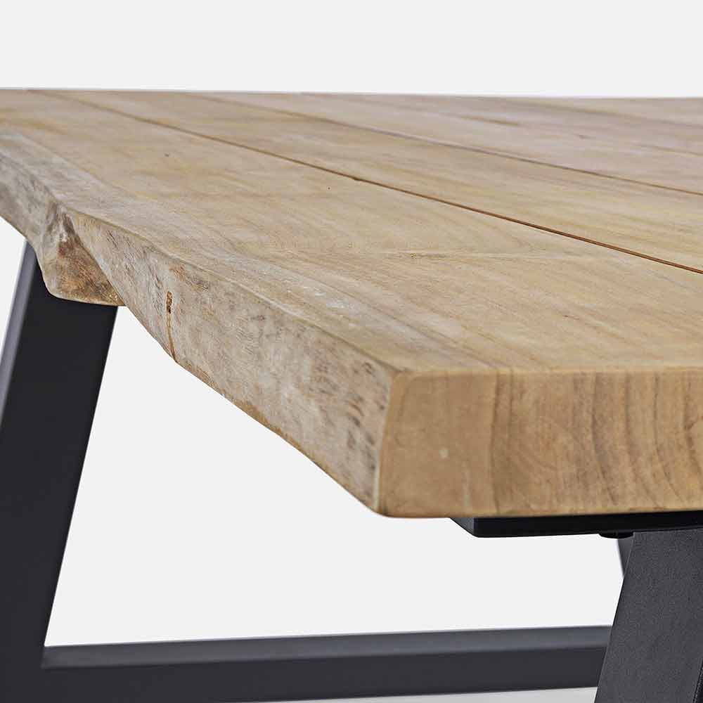 Teakholzplatte (Originalblockabschnitte) - svlk (zertifiziertes Holz aus nachhaltiger Forstwirtschaft). naturbelassen, Beine aus pulverbeschichtetem Aluminium (Polyester). Schrauben aus verzinktem Stahl. Verstellbare Füße.