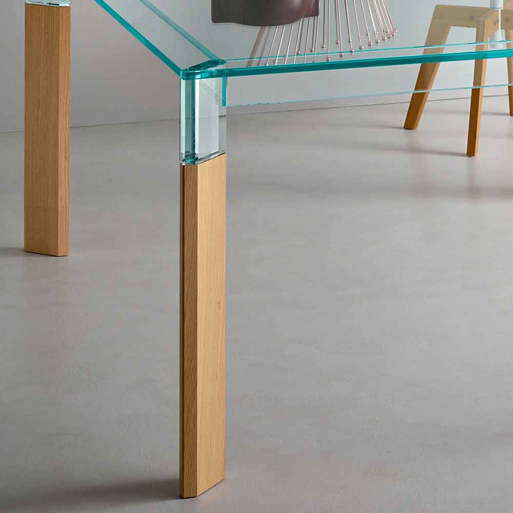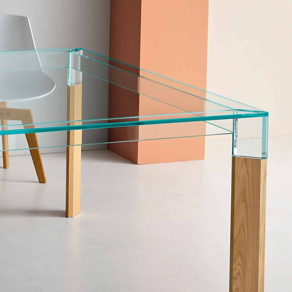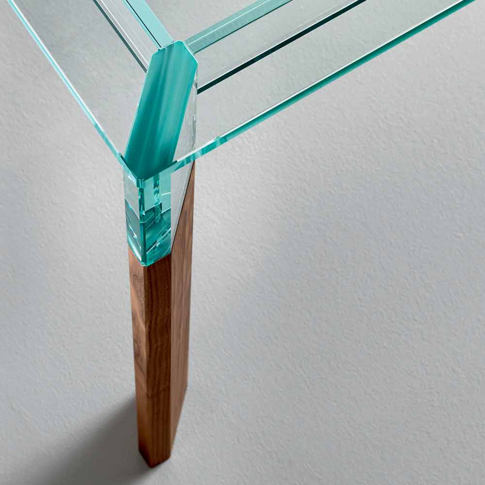 Luxuriöser Esstisch mit extra klarer Glasplatte und Massivholzbasis, hergestellt in Italien.