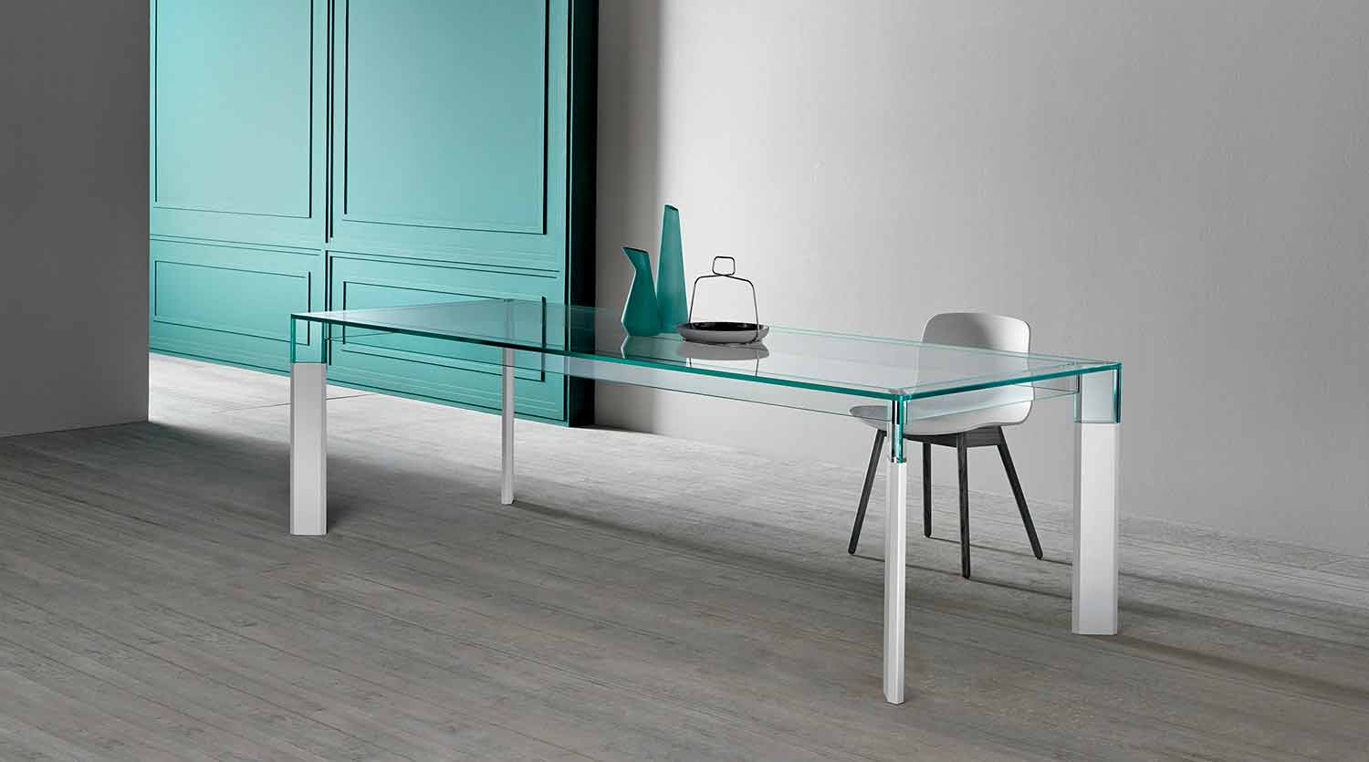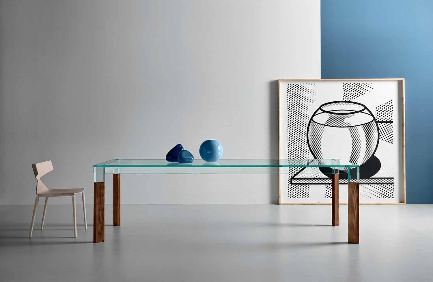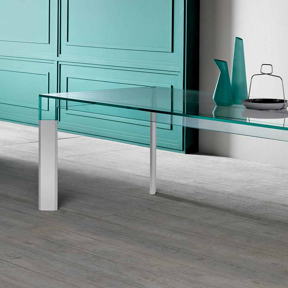Luxuriöser Esstisch mit extra klarer Glasplatte und Massivholzbasis, hergestellt in Italien.