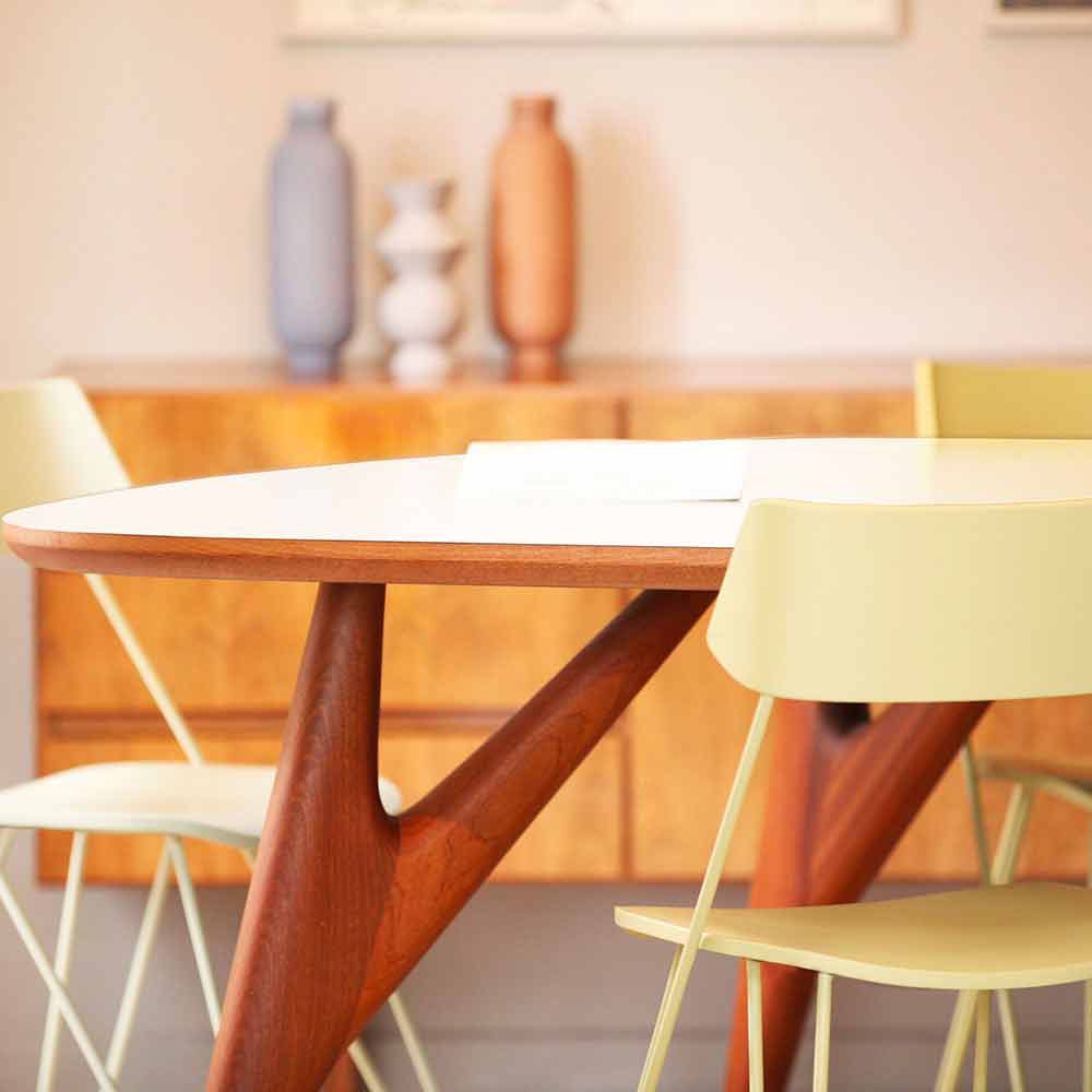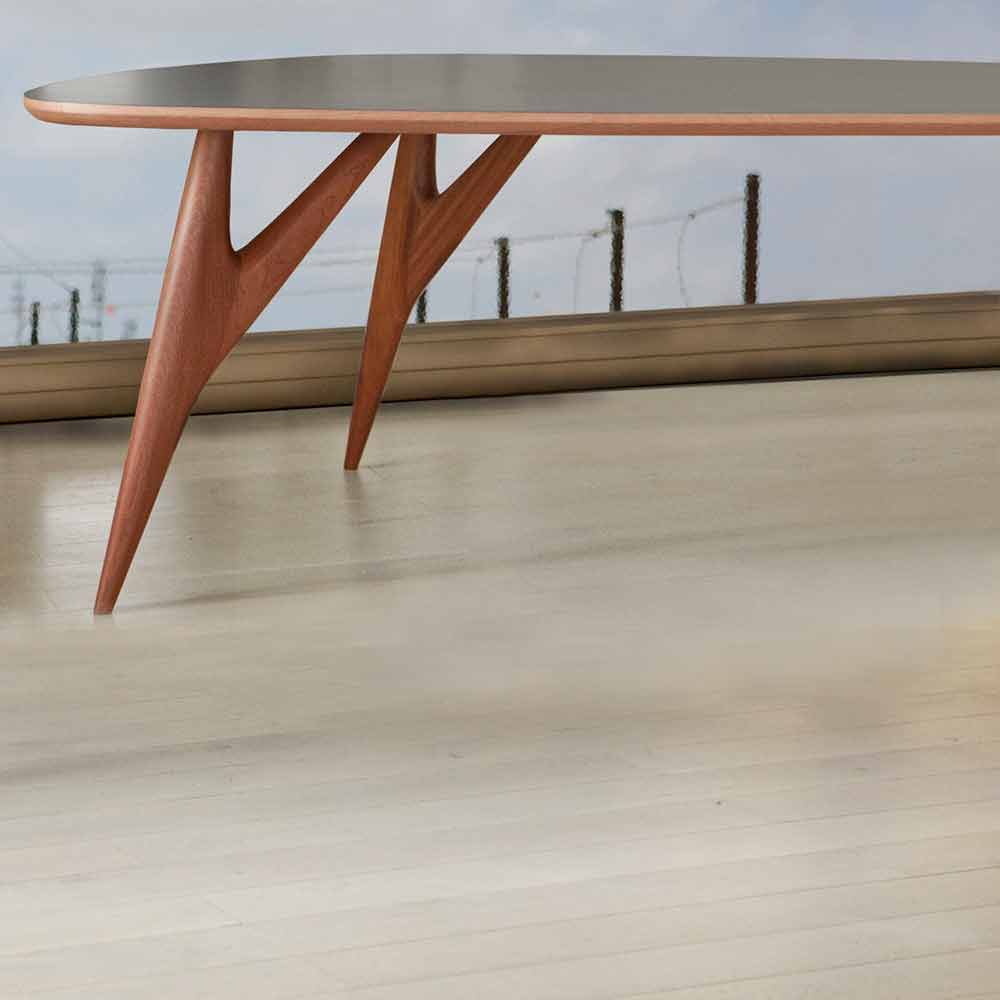 Die zeitlose Eleganz von Massivholz wird mit der Modernität von HPL kombiniert, um eine Einrichtungslösung mit einem beispiellosen Stil zum Leben zu erwecken, der sich an jede Umgebung anpassen kann, eine kreative und edle Note mit sich bringt und zum wahren Protagonisten des Rauminneren wird . Aus der Wahl hochwertiger und hochwertiger Rohstoffe, die von erfahrenen Handwerkern fachmännisch verarbeitet wurden, entsteht eine revolutionäre Einrichtungsidee, die sich durch die zarte Segelform des Verdecks und die ursprüngliche Gabel der Beine auszeichnet, die das Design bereichert. Diese Besonderheiten ermöglichen es dem Tisch, ein Gefühl von Leichtigkeit zu vermitteln und gleichzeitig eine unglaubliche Harmonie mit den umgebenden Möbeln zu schaffen, wodurch jeder Raum erobert wird.