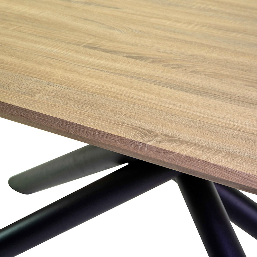 Esstisch mit schwarz pulverbeschichtetem Metallgestell und 47 mm starker MDF-Tischplatte in natürlicher Holzoptik.