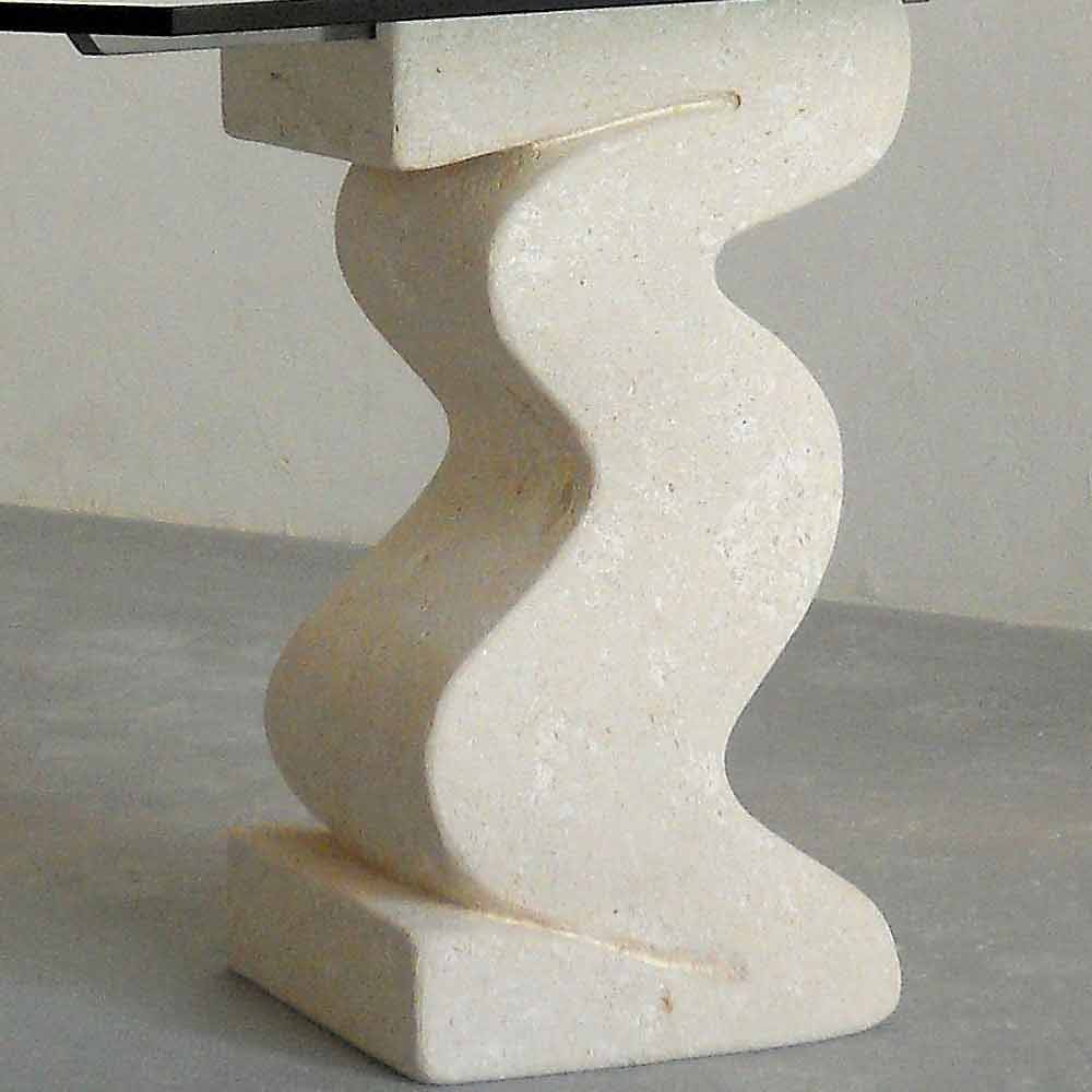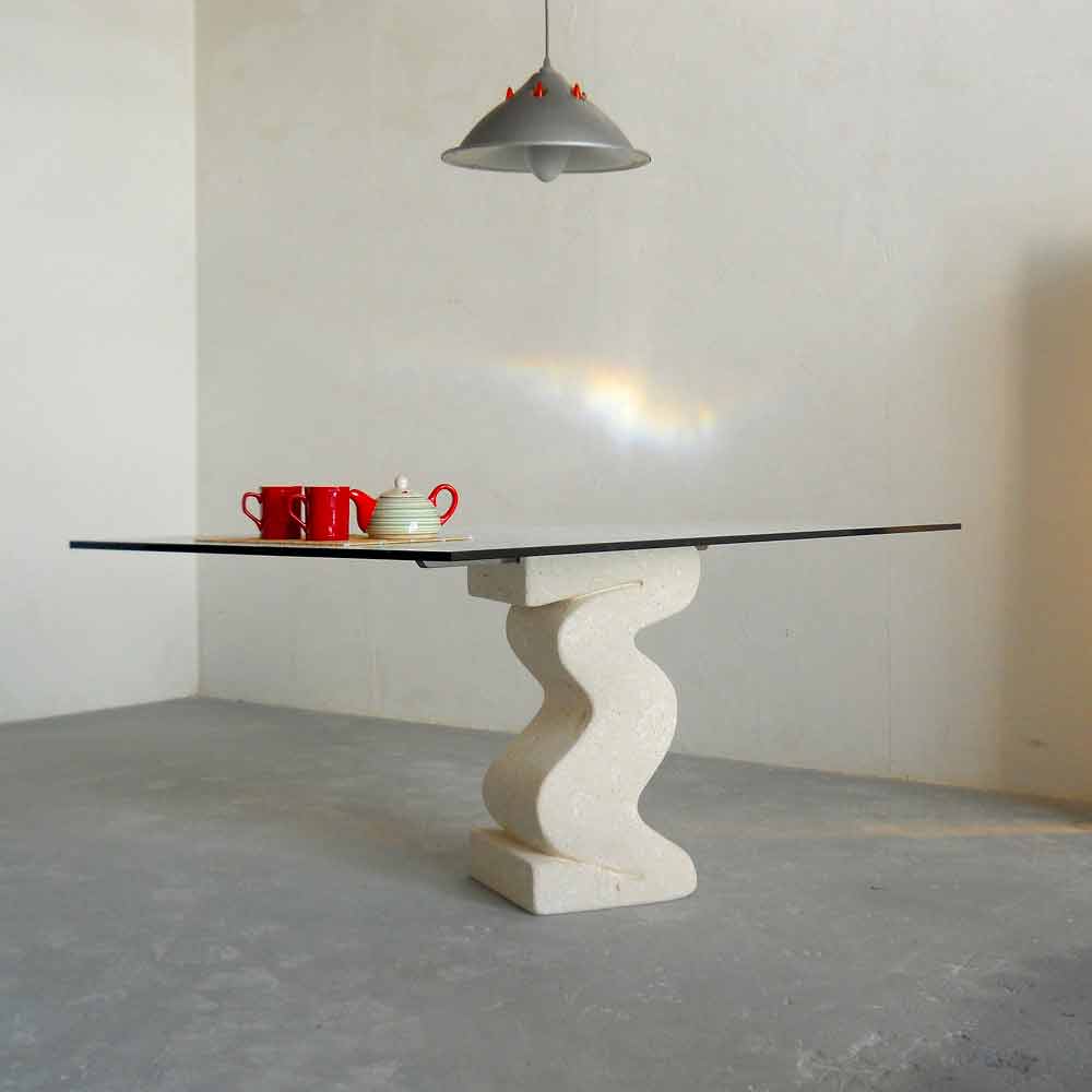 Die Basis ist aus Naturstein aus Vicenza hergestellt und wird von Hand bearbeitet. Die Tischplatte besteht aus Kristall float mit einer Dicke von 15 mm und ist an dem Stein mit einem Flansch befestigt.