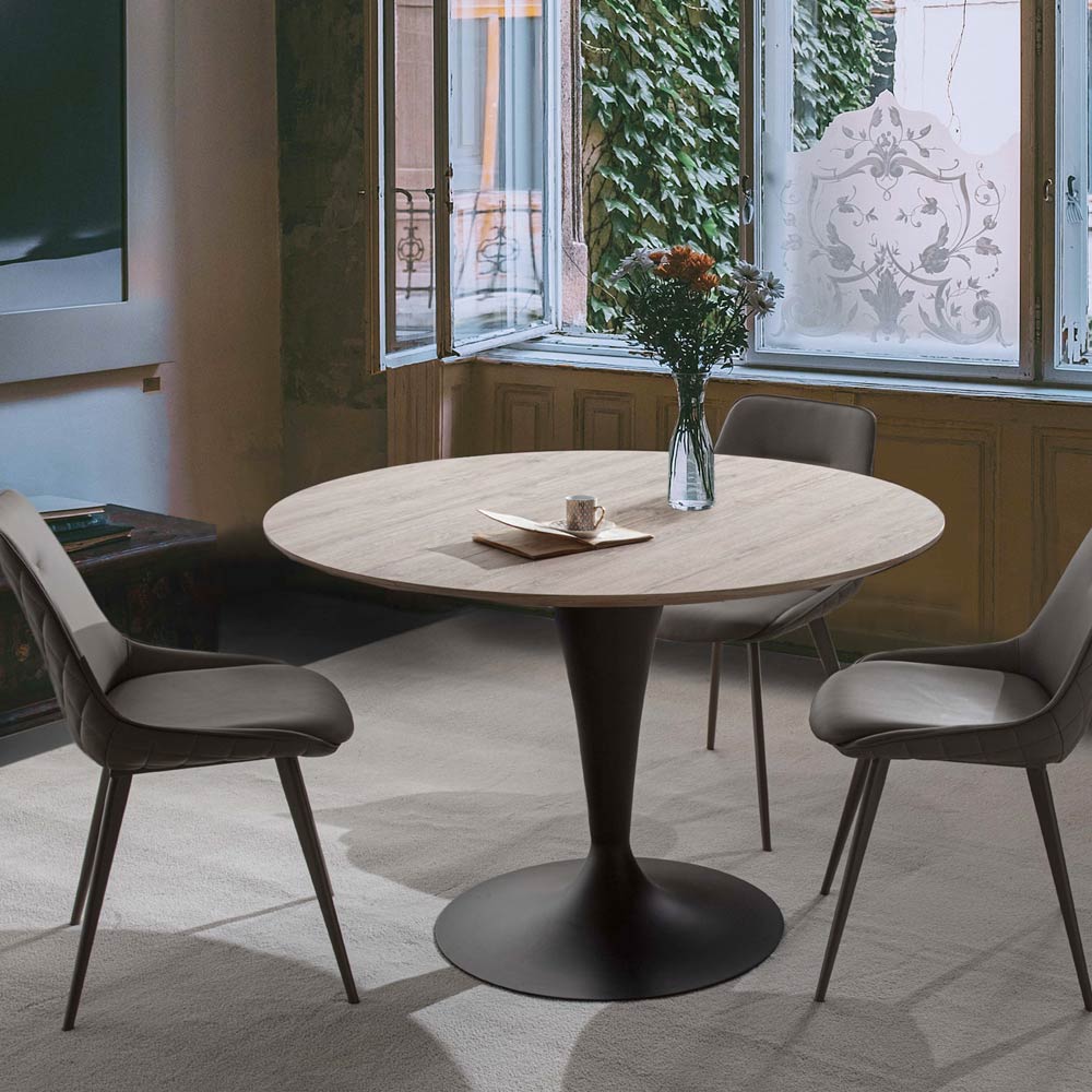 Wunderschöner Esstisch mit runder Platte aus beschichtetem Schichtholz (H 30 mm), strukturiertes Eichen -Finish mit ausgestellter Kante aus mdf und basis aus schwarz lackiertem stahl . Was diesen Tisch einzigartig und besonders funktional macht, ist die Möglichkeit, die Platte dank einer externen Verlängerung von 50 cm zu verlängern, wodurch eine maximale Länge von 170 cm erreicht wird und bis zu 8 Personen Platz finden, während ein kleiner Tisch gewährleistet ist. die die Räume Ihres Hauses nach dem Schließen optimieren können. Eleganz und Funktionalität sind die Schlüsselwörter, die dieses moderne Möbelstück am besten beschreiben, das einen äußerst zeitgenössischen Look verkörpert, der in der Lage ist, die Ästhetik des Raums zu bereichern, indem es die Möbel mit Nüchternheit vervollständigt.