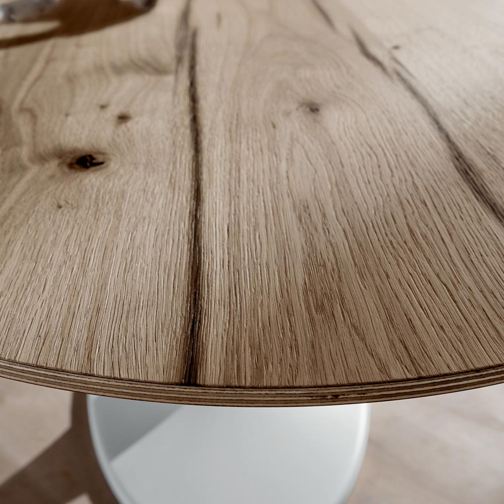 Birkensperrholz furniert in gealterter Eiche mit Kanten, die mit schützendem Leinöl behandelt wurden, und Sockel aus