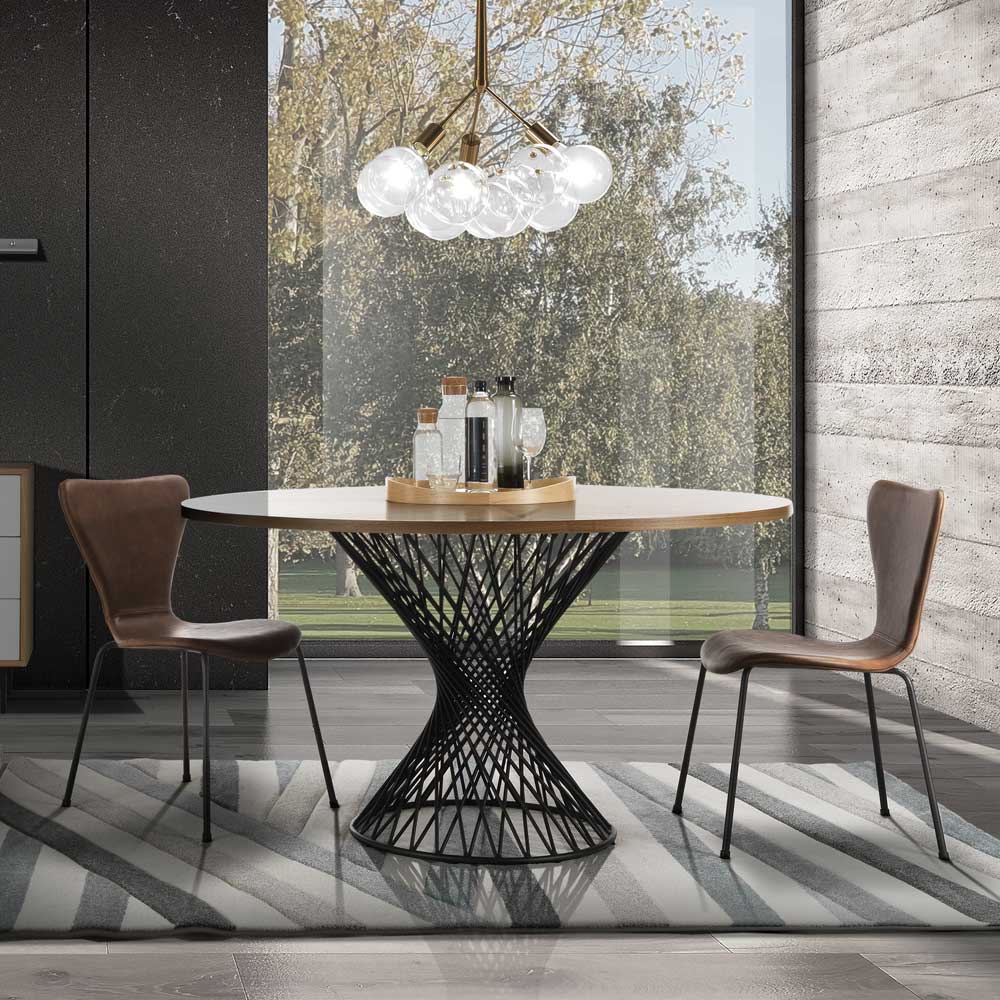 Runder Esstisch aus furniertem MDF und mattschwarzem Metall.