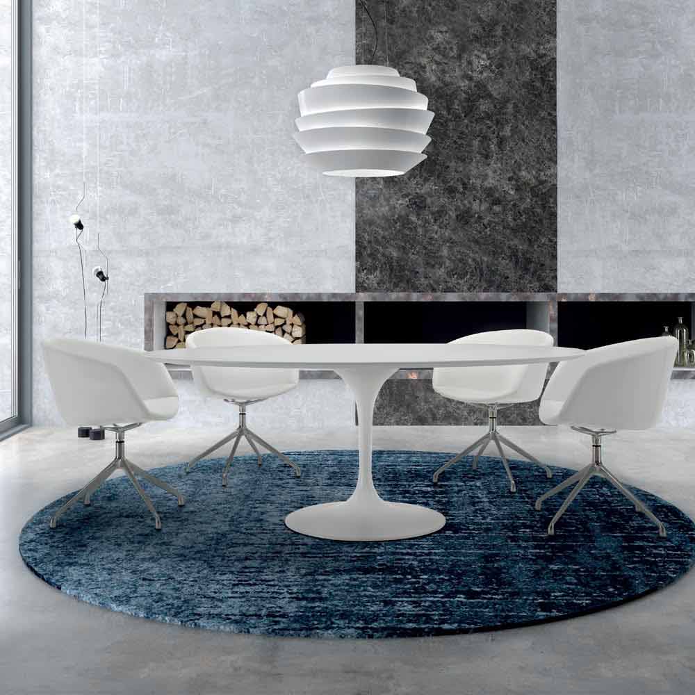 Moderner runder Esstisch mit flüssiger Laminatplatte und Aluminiumbasis, hergestellt in Italien.