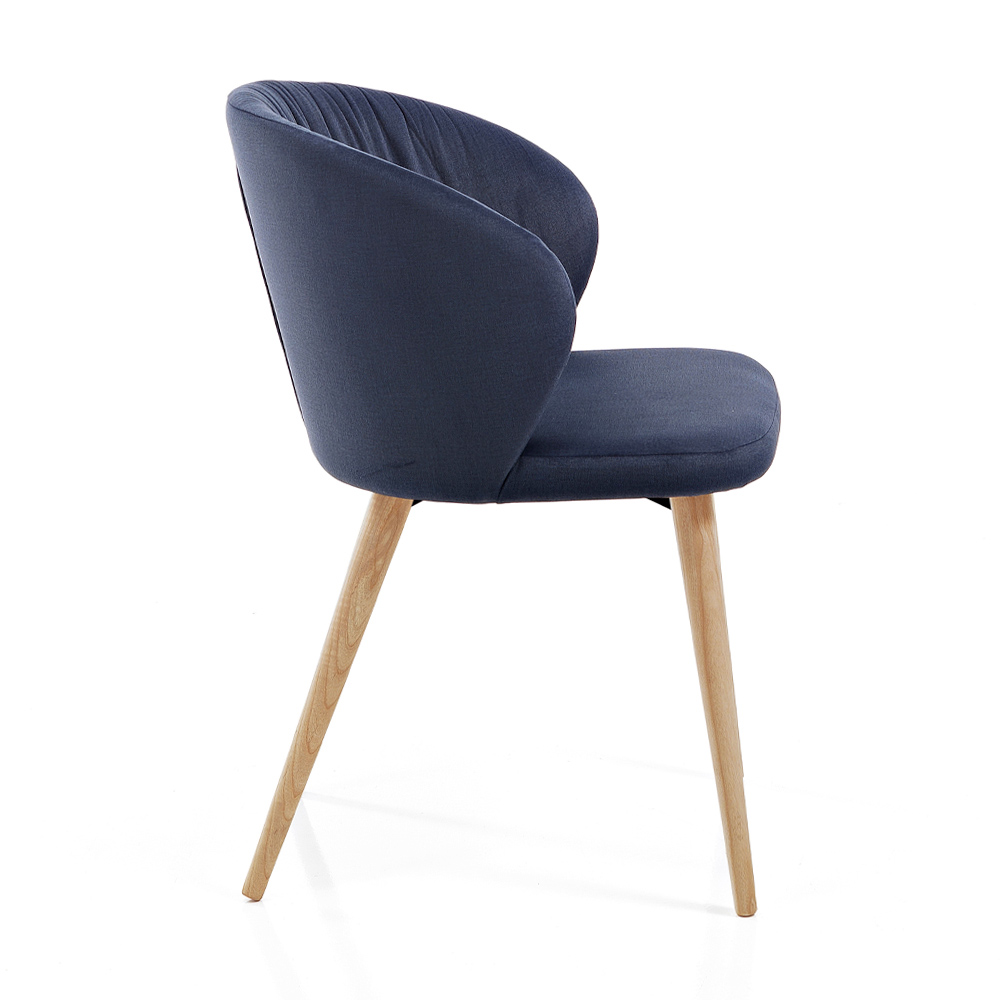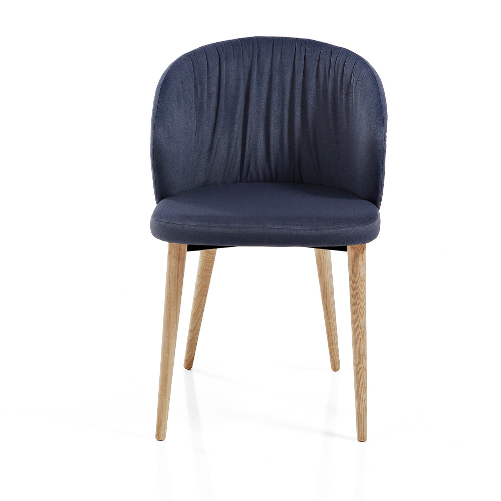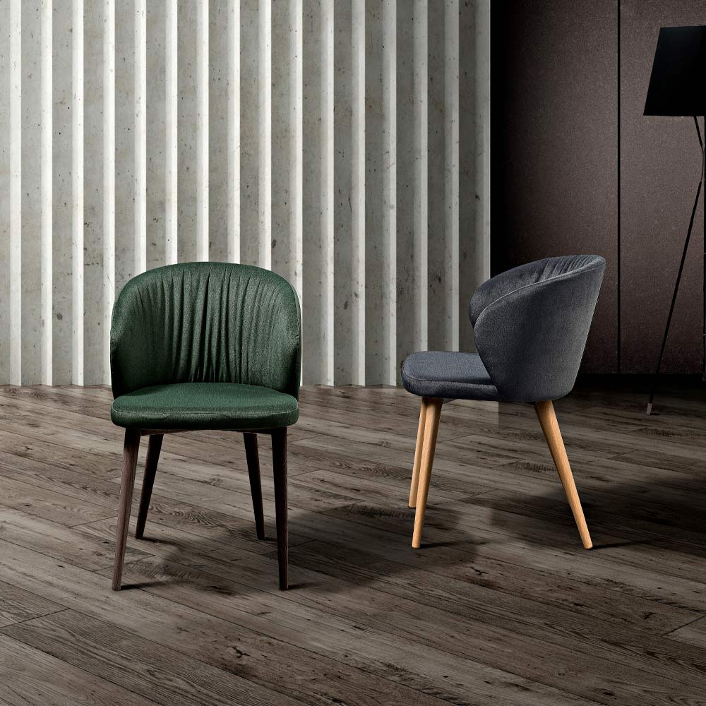 Schalensessel mit Bezug aus farbigem Stoff und konischen Eschenbeinen in modernem Design, hergestellt in Italien.
