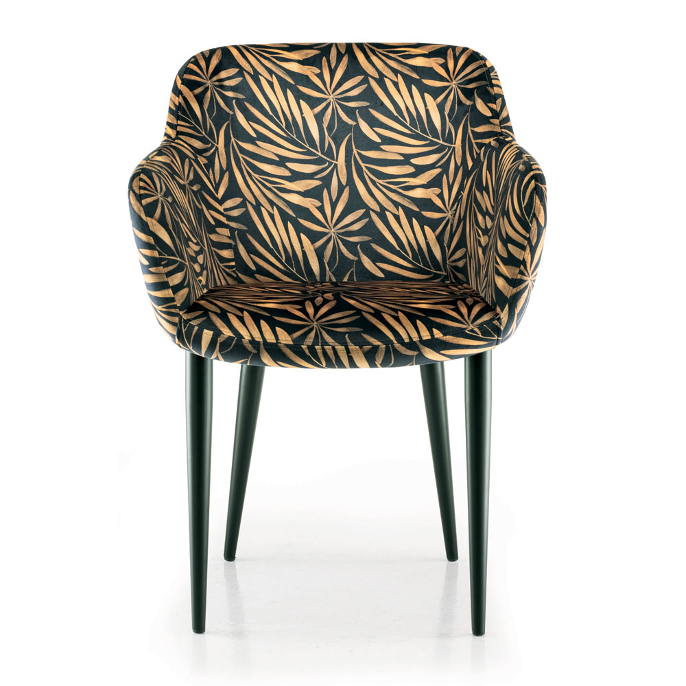 Esszimmerstuhl , hergestellt in Italien , komplett mit Stoff bezogen und mit schwarz lackierten Stahlbeinen . Ein imposantes und raffiniertes Design , das perfekt zu modernen Umgebungen passt, in denen es dank seiner starken zeitgenössischen Persönlichkeit zum Protagonisten wird. Die perfekte Kombination zwischen dem modernen Touch von Stahl und dem originellen Aussehen des Stoffes und seiner Textur ermöglicht die Schaffung einer exklusiven Einrichtungslösung, ideal für diejenigen, die Funktionalität und Design in einem einzigen Produkt suchen. Der Sitz zeichnet sich durch weiche und umhüllende Linien und Formen aus , die für hervorragenden Komfort sorgen und gleichzeitig eine originelle und moderne Ästhetik bieten.