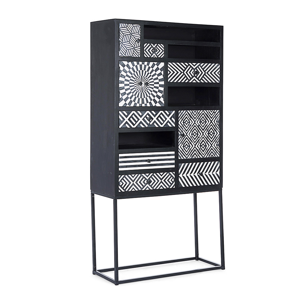 Die 4 Türen und 6 Schubladen werden in Mosaikverarbeitung durch die Verwendung von kleinen Harzblöcken mit einer Oberfläche auf Nitrozellulosebasis hergestellt.