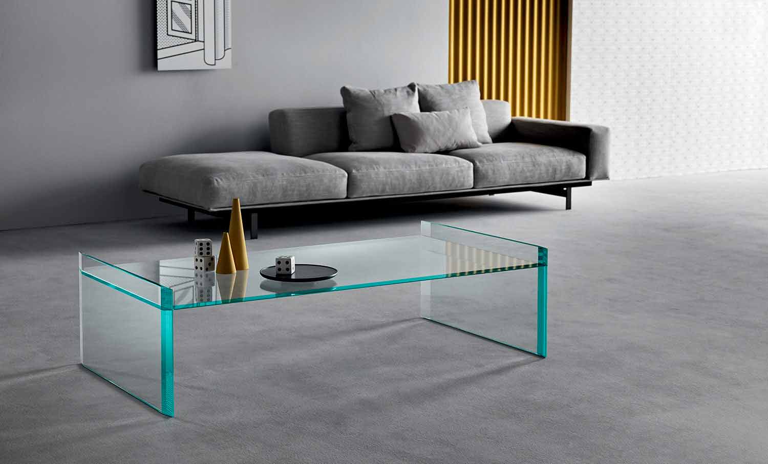 Couchtisch in modernem Design aus extra klarem Glas mit abgeschrägten Kanten, handgefertigt in Italien.