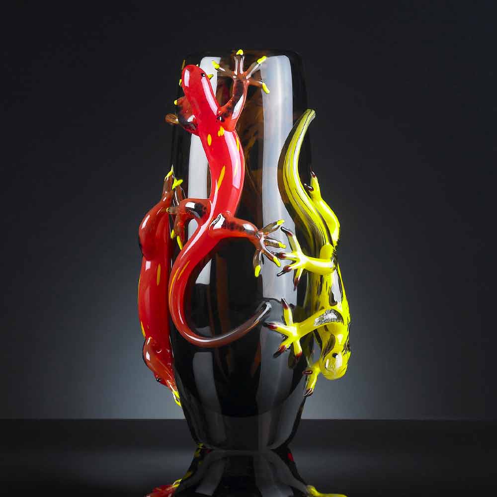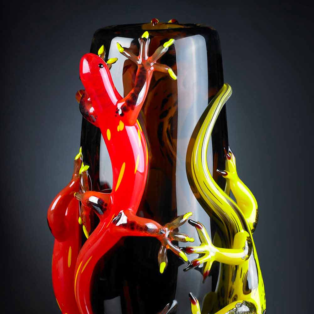 Glas, handgefertigt in Italien von Glasmachermeistern, die seit Generationen Experten auf dem Sektor sind, bereichert durch 4 Geckos in Gelb- und Rottönen. Ein exzentrisches Dekorationselement, das dank seiner
