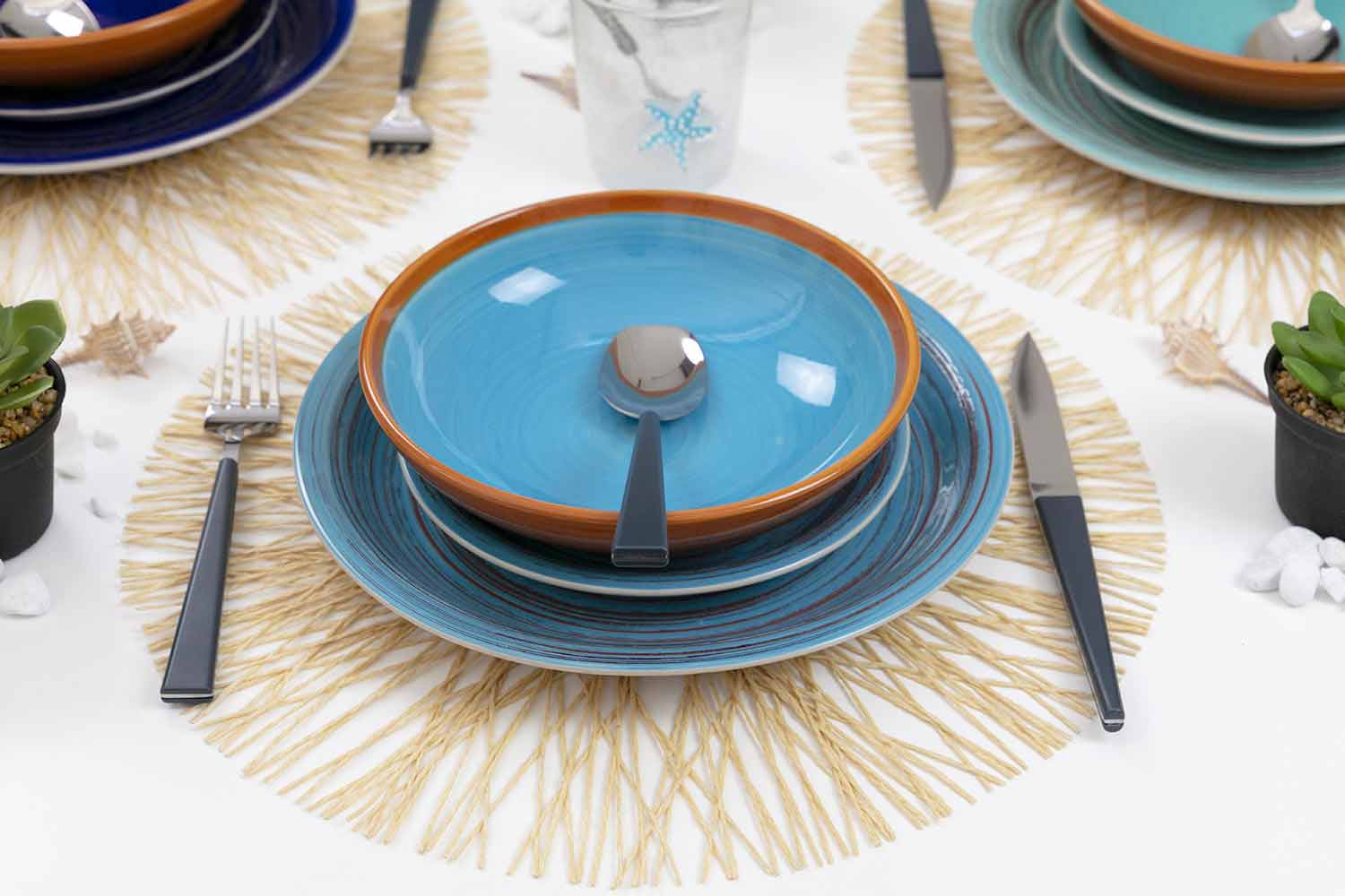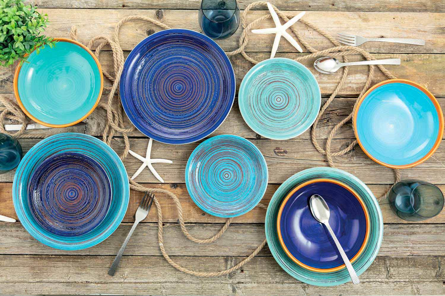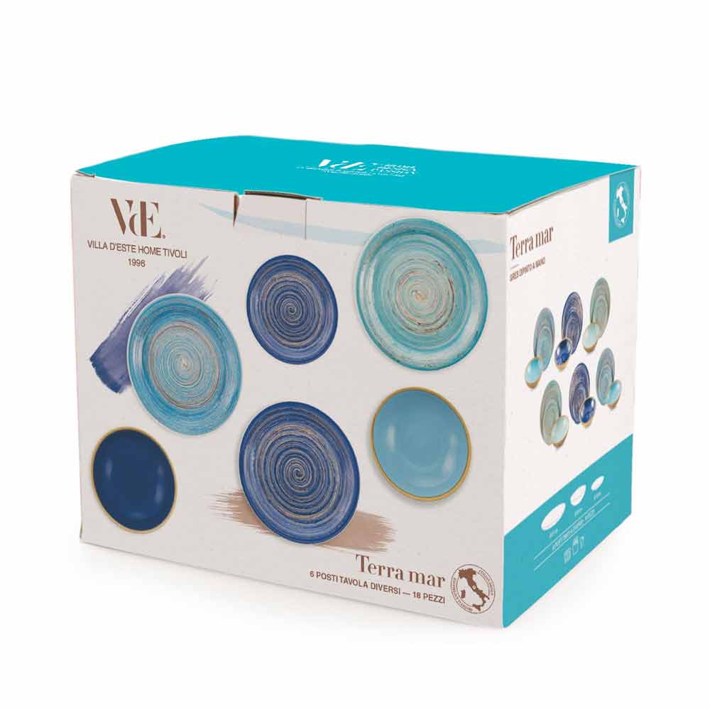 Dieser Service wurde von den Egadi-Inseln des Mittelmeers inspiriert, insbesondere von der Insel Favignana, der Königin des Archipels, für ihre makellose Schönheit und ihre Farben, die auf den Tellern gezeigt werden, mit denen sich das Blau des Meeres mit seinen Schattierungen schneidet Die Adern auf Beige erinnern an warmweißen Sand.