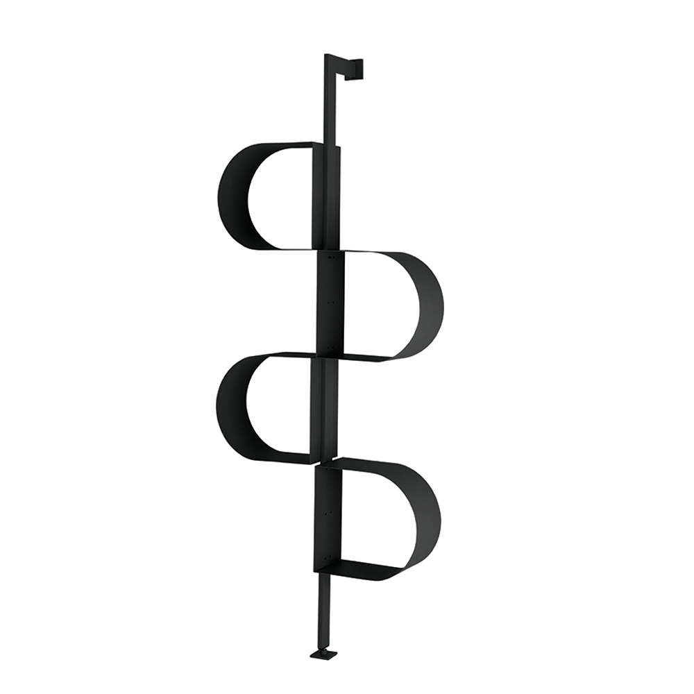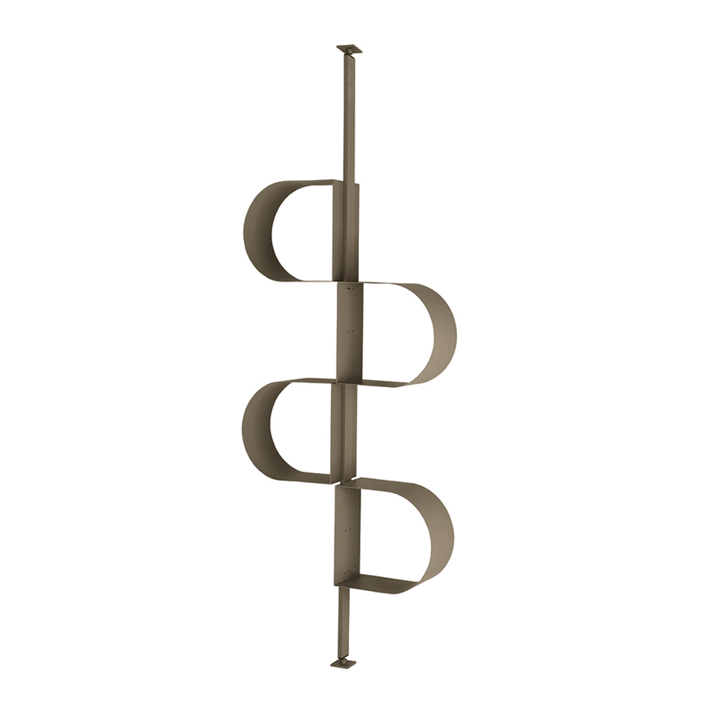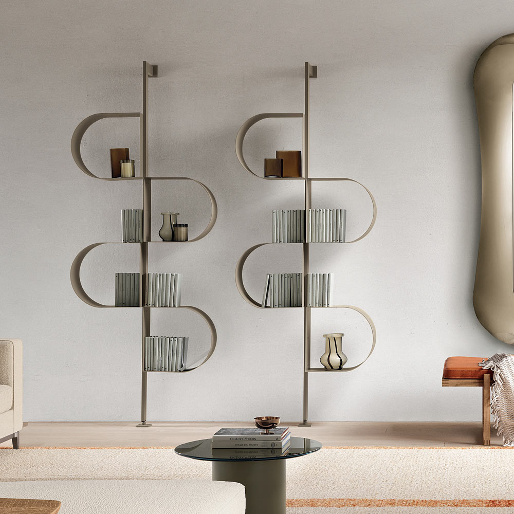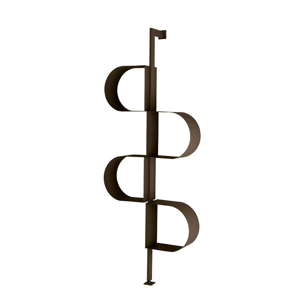 Das aus lackiertem Metall gefertigte Bücherregal erstreckt sich vertikal und erinnert mit seiner an ein durchgehendes Band erinnernden Struktur durch eine rhythmische Abfolge von Ablagefächern . Dieses besondere Design ermöglicht es, Bücher und Dekorationsgegenstände originell und harmonisch zu arrangieren.