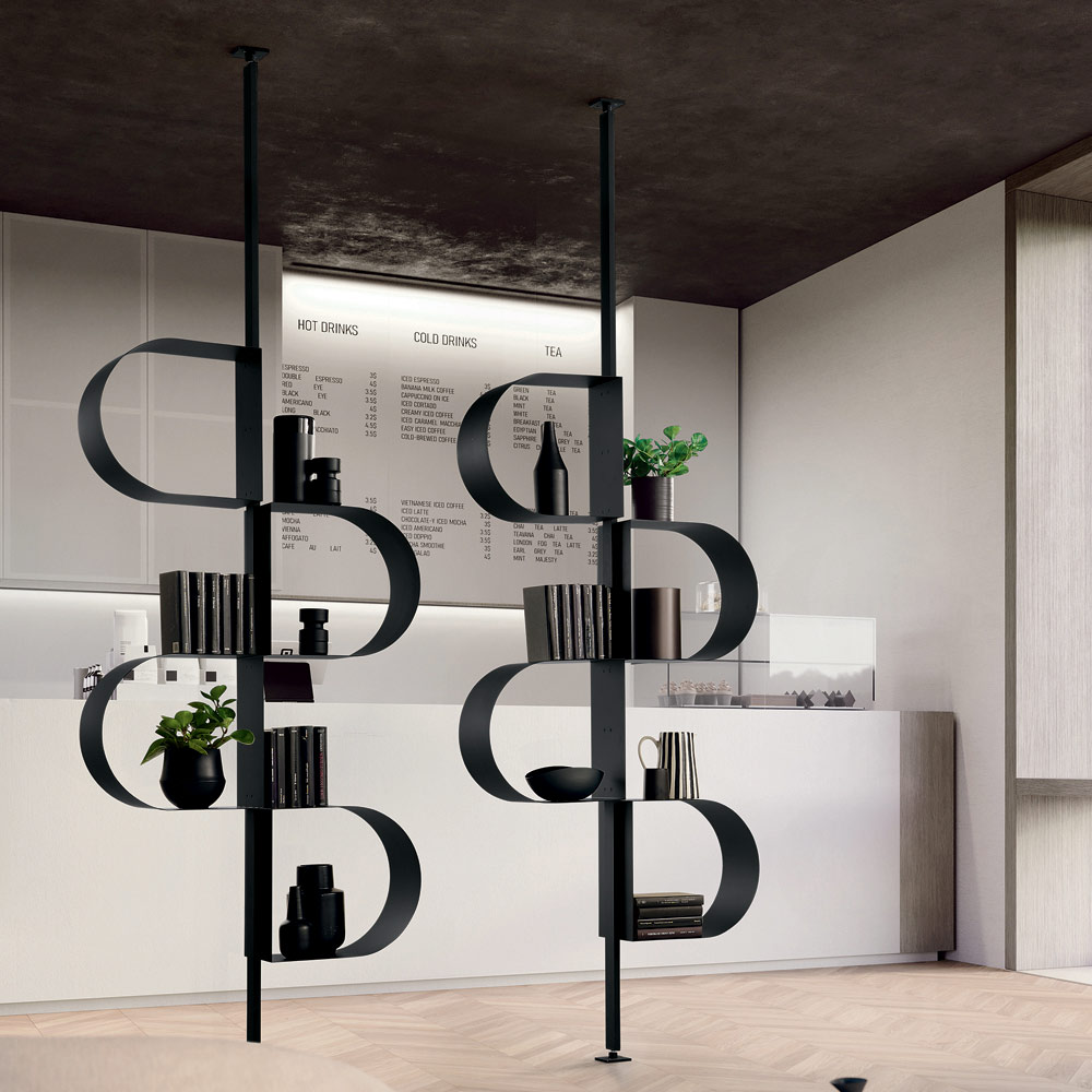 Das vielseitige und funktionale Bücherregal ist zur Wand- oder Deckenmontage erhältlich. Die deckenmontierte Version kann auch als Raumteiler verwendet werden und schafft so dezente Abgrenzungen, ohne den Raum zu erdrücken.