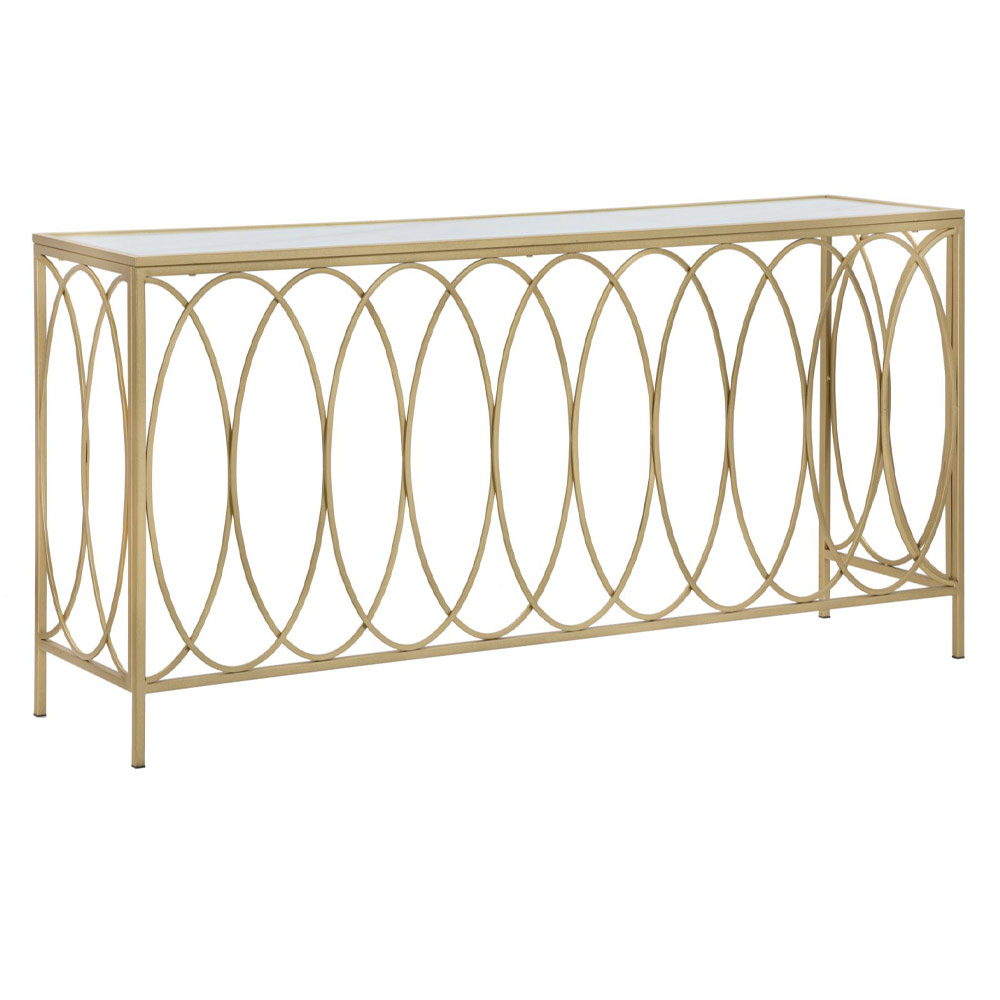 Feste Eingangskonsole aus Eisen mit Goldfinish und Glasplatte mit weißem Marmoreffekt.