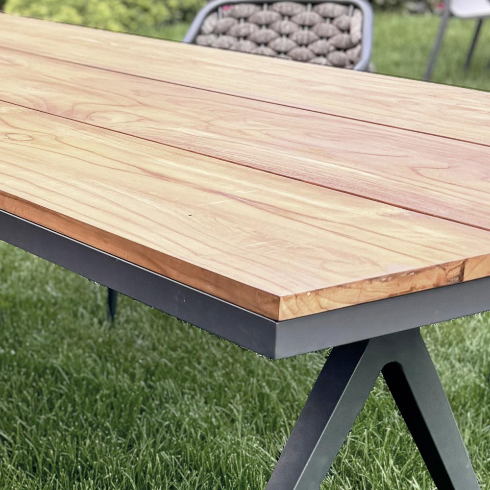 Gartentisch mit anthrazit lackierter Aluminiumstruktur und massiver Teakholzlattenplatte.