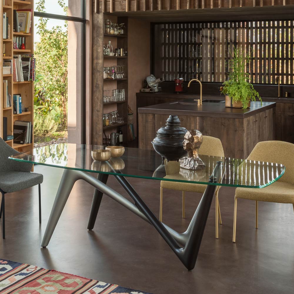 in Italien hergestellt. Der Tisch in fester Ausführung ist eine vielseitige Lösung für verschiedene Einrichtungsstile. Die Glasplatte in Kombination mit dem lackierten Sockel trägt dazu bei, den Charakter des Hauses zu definieren. Erhältlich in zwei verschiedenen Plattengrößen, um den Platzbedarf besser zu erfüllen. Die Tischstruktur umfasst Beine aus lackiertem Hartpolyurethan, und die tonnenförmige Platte besteht aus extraklarem, transparentem Hartglas mit abgeschrägter Kante und bietet die Wahl zwischen einem modernen und eleganten Look oder einem traditionelleren und robusteren Look.