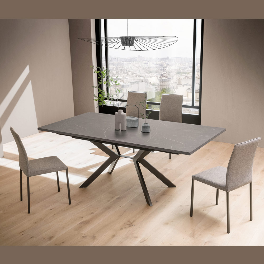 Der Sockel aus lackiertem Metall mit gekreuztem geometrischem Design bietet Stabilität und eine skulpturale Note, die nicht unbemerkt bleibt. Eine perfekte Einrichtungslösung für Esszimmer, offene Räume oder Vertragsumgebungen mit raffiniertem Stil.