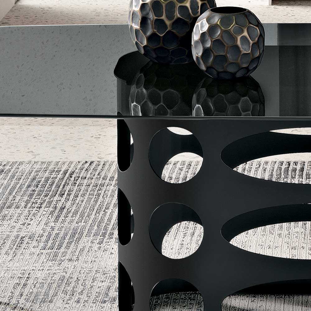 Ein eleganter, in Italien gefertigter Designertisch, der Ihrem Ess- oder Wohnzimmer eine persönliche Note verleiht. Der Tisch besticht durch sein einzigartiges, lackiertes Metallgestell mit raffinierten elliptischen und kreisförmigen Perforationen , die ein faszinierendes grafisches Spiel von Masse und Leere erzeugen.