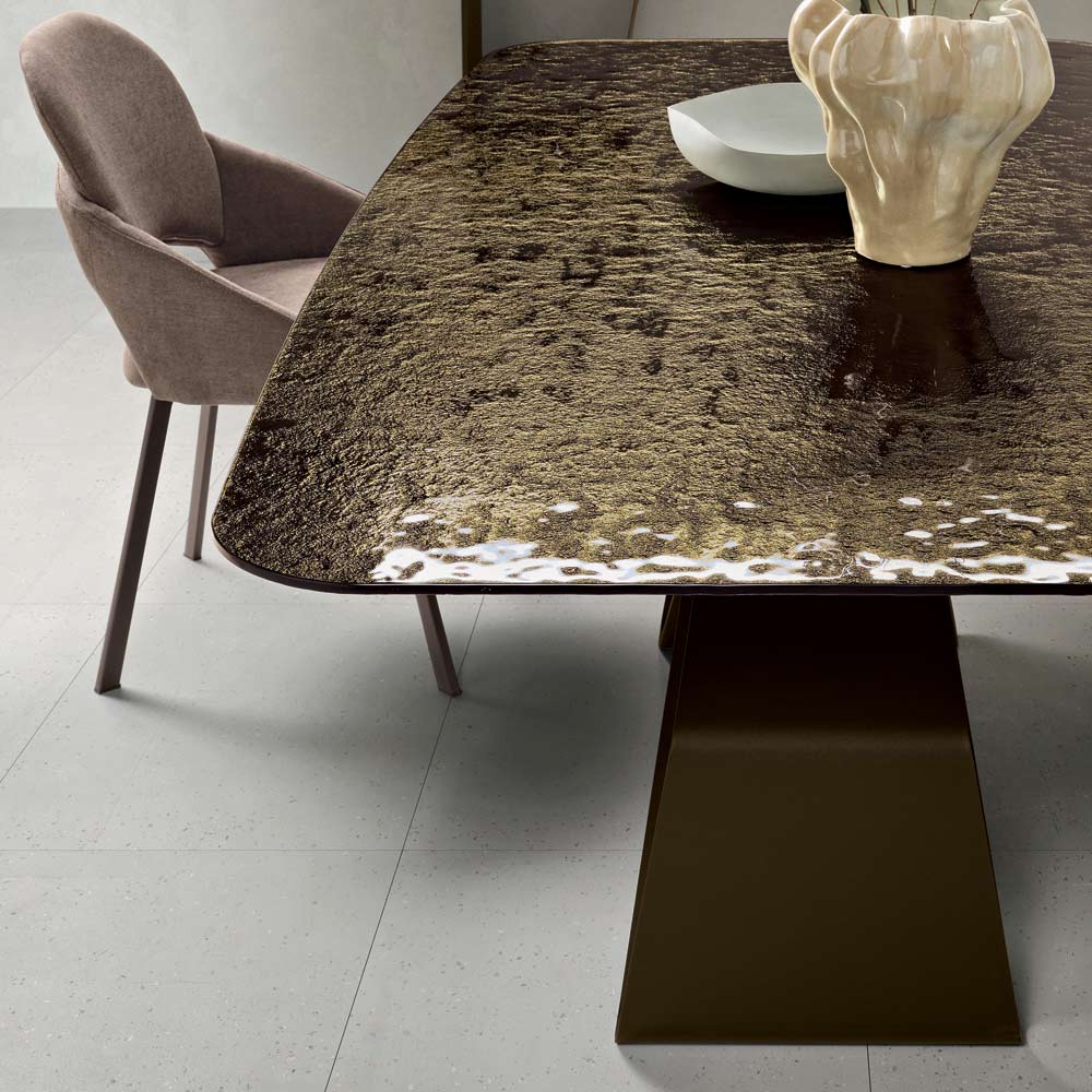 Die gehämmert Glasplatte verleiht dem Tisch dank ihrer einzigartigen, strukturierten Oberfläche, die das Licht unregelmäßig reflektiert und so ein faszinierendes Spiel von Reflexionen und Tiefe erzeugt, eine ganz besondere Note. Diese Oberflächenbehandlung verstärkt die Leuchtkraft des Glases und macht die Tischplatte elegant und ausdrucksstark.