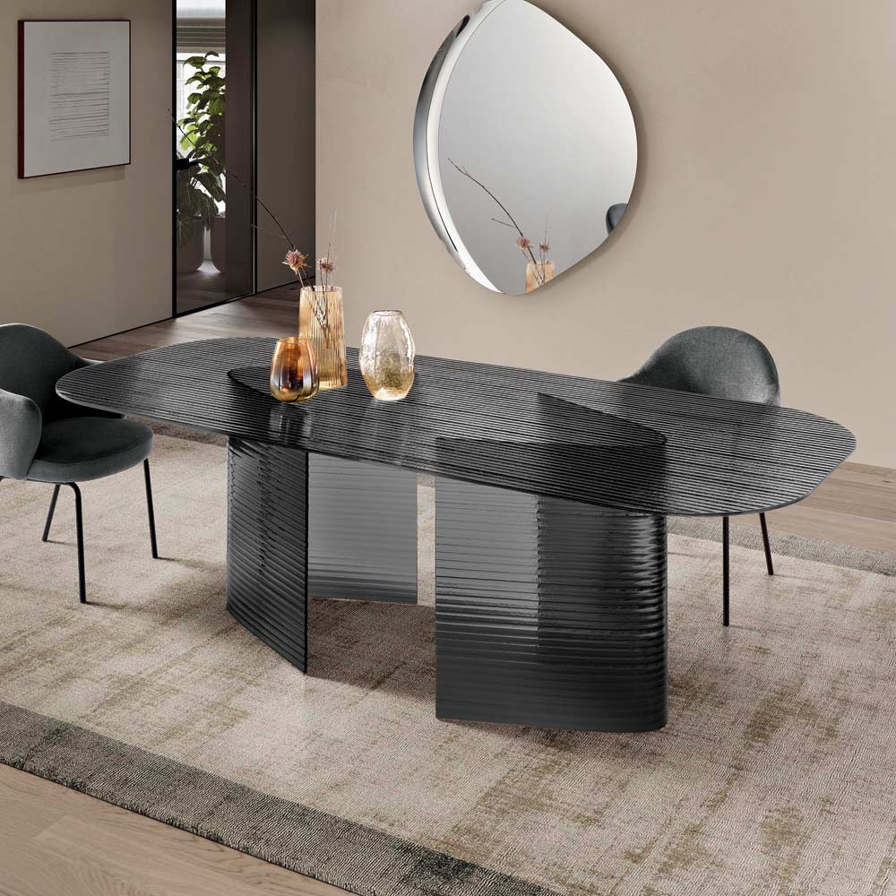 Der markante , aus zwei geschwungenen Elementen bestehende Fuß bildet eine skulpturale und dynamische Struktur, die zum eigentlichen Blickfang des Tisches wird. Die Transparenz des Glases unterstreicht das Design und lässt Räume optisch hell wirken – ideal für moderne und elegante Ambiente.